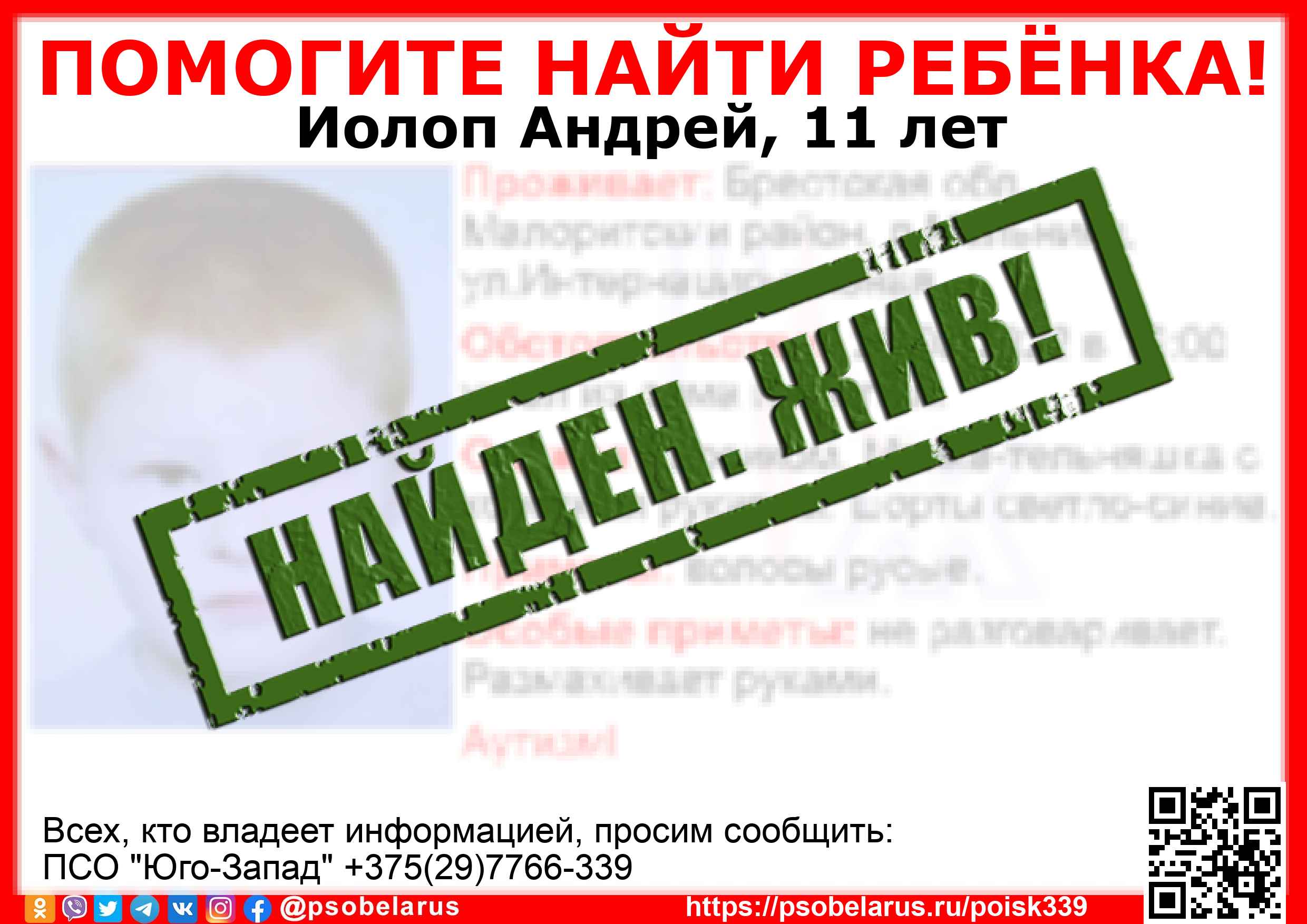 | Всех, кто владеет информацией, просим сообщить: ПСО "Юго-Запад" +375(29)7766-339 |  |