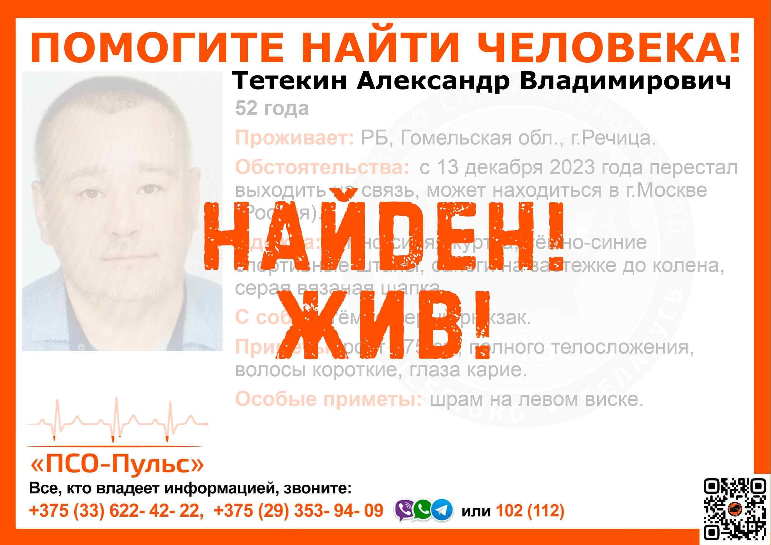 Всех, кто владеет информацией, просим сообщить: ПСО "ПСО-Пульс" +375(33)622-4222 |