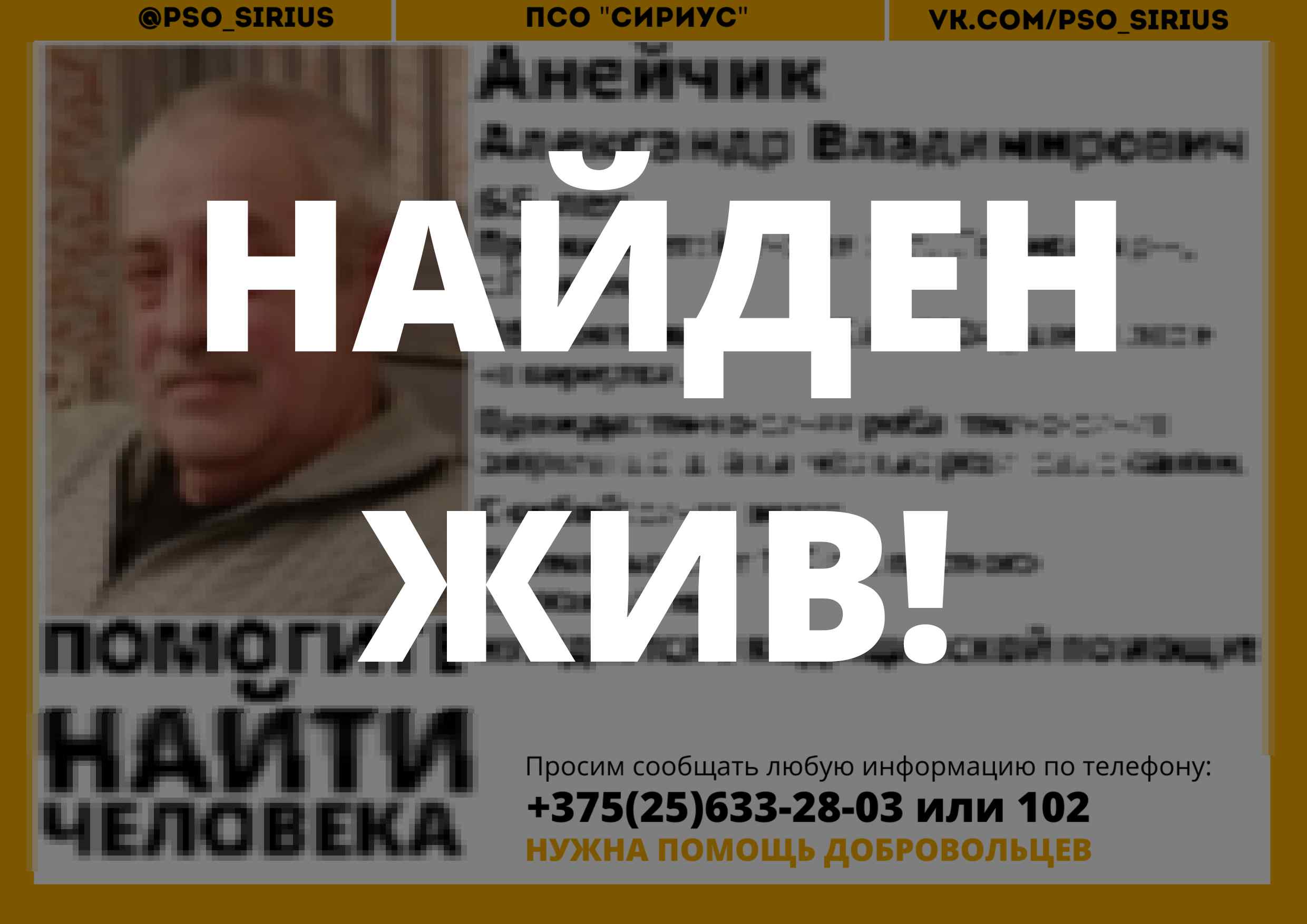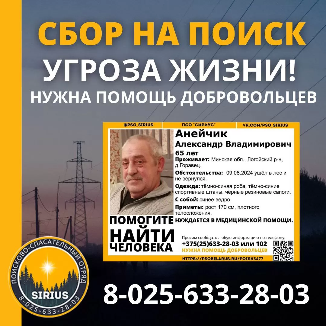 Всех, кто владеет информацией, просим сообщить: ПСО "Сириус" +375(25)633-28-03 |