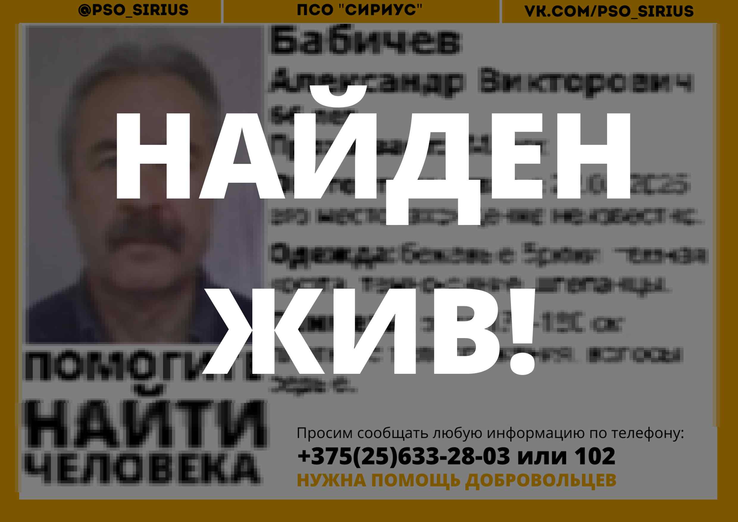 Всех, кто владеет информацией, просим сообщить: ПСО "Сириус" +375(25)633-28-03 |