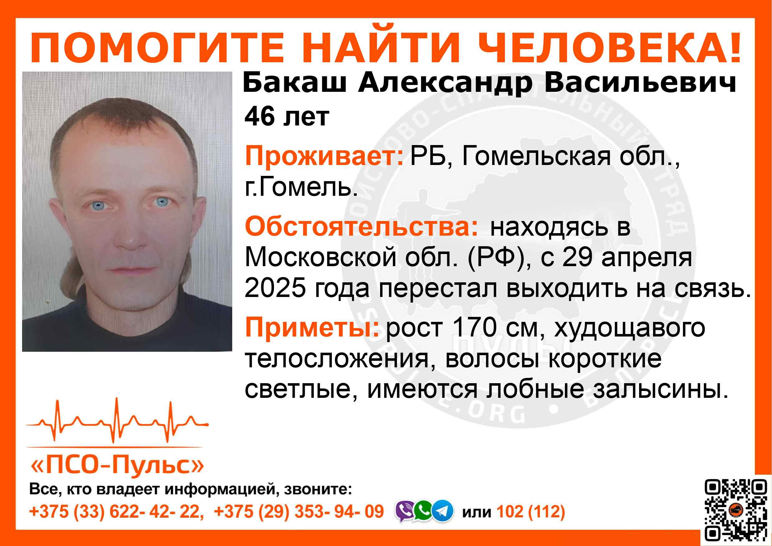 Всех, кто владеет информацией, просим сообщить: ПСО "ПСО-Пульс" +375(33)622-4222 |