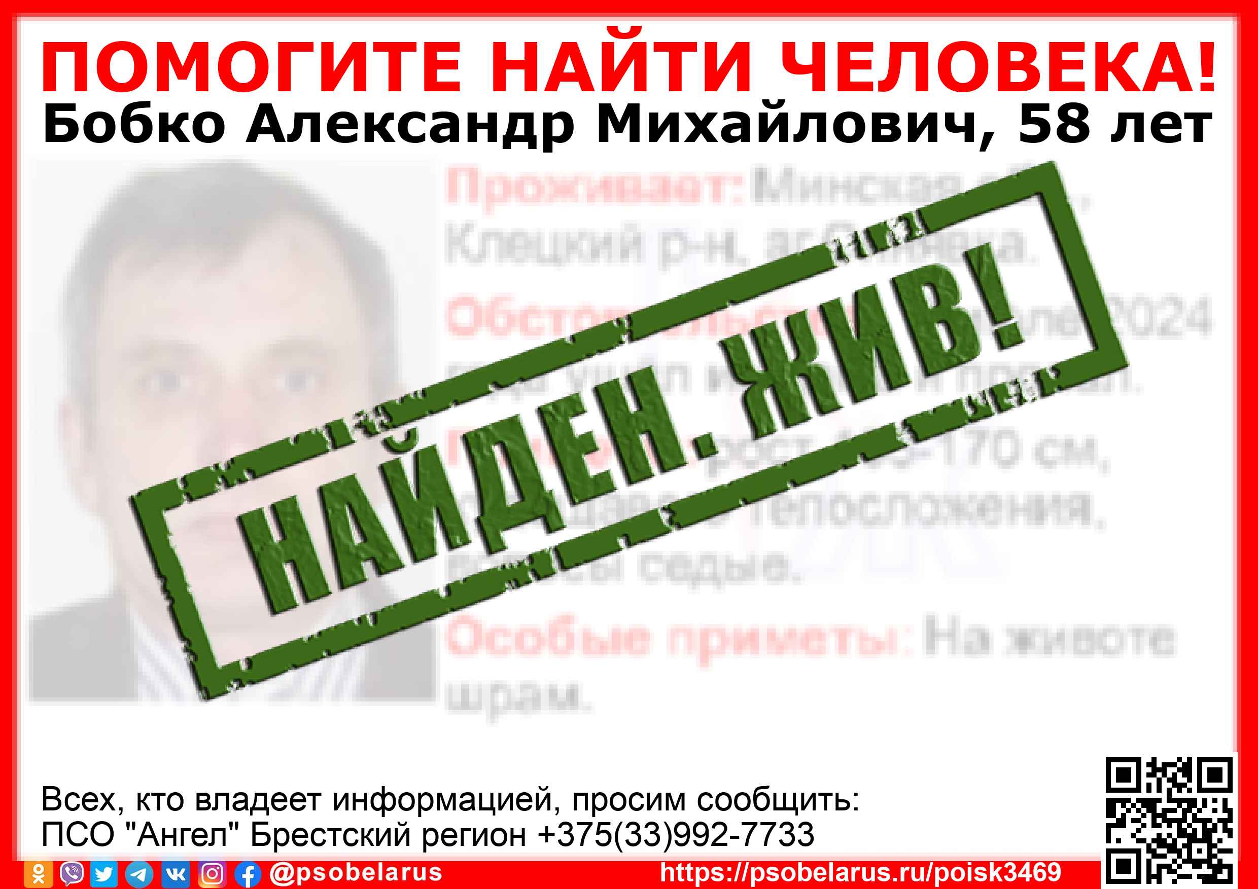 Всех, кто владеет информацией, просим сообщить: ПСО "Ангел" Брестский регион +375(33)992-7733 |