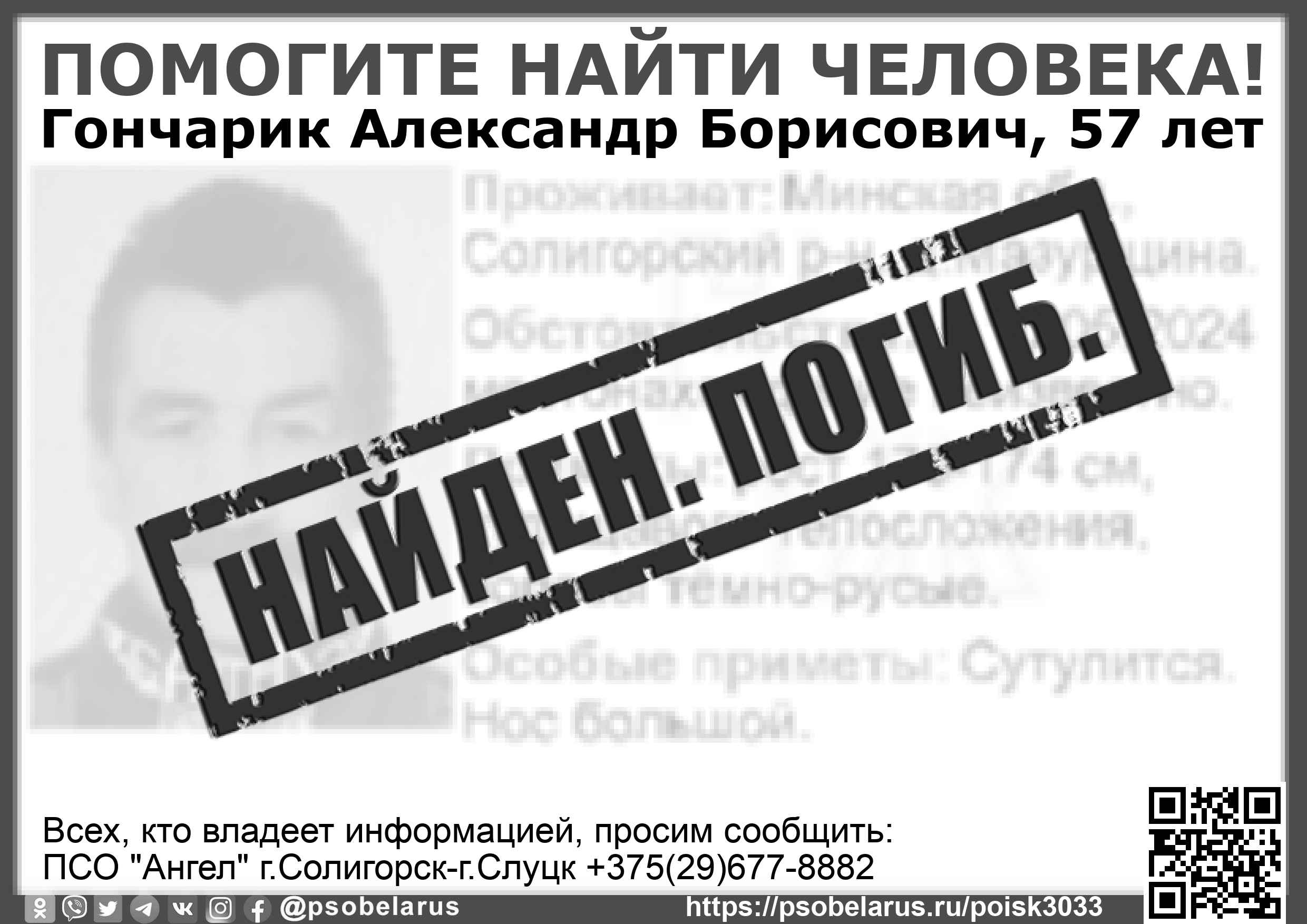 Всех, кто владеет информацией, просим сообщить: ПСО "Ангел" г.Солигорск-г.Слуцк +375(29)677-8882 |