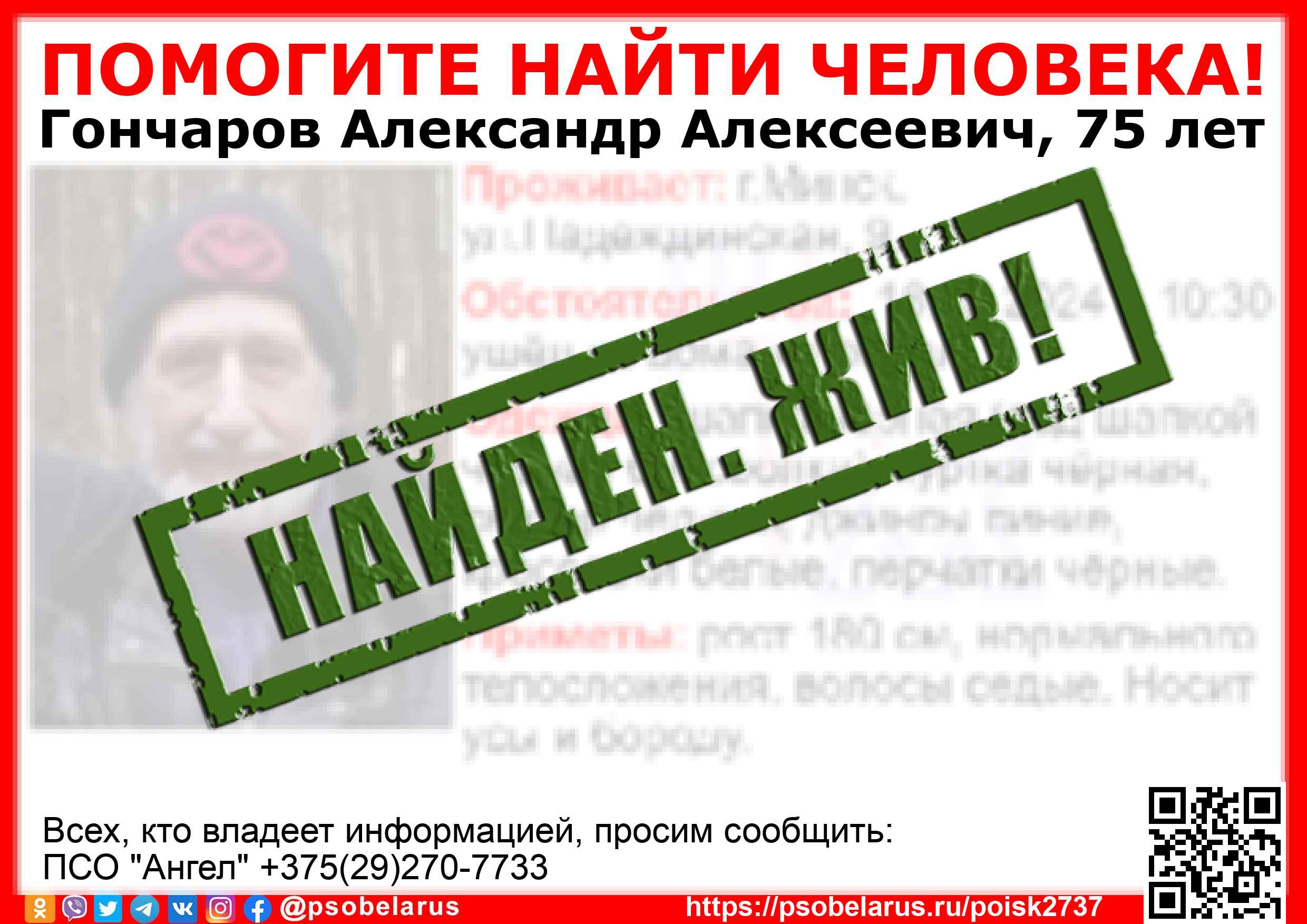 Всех, кто владеет информацией, просим сообщить: ПСО "Ангел" +375(29)270-7733 |