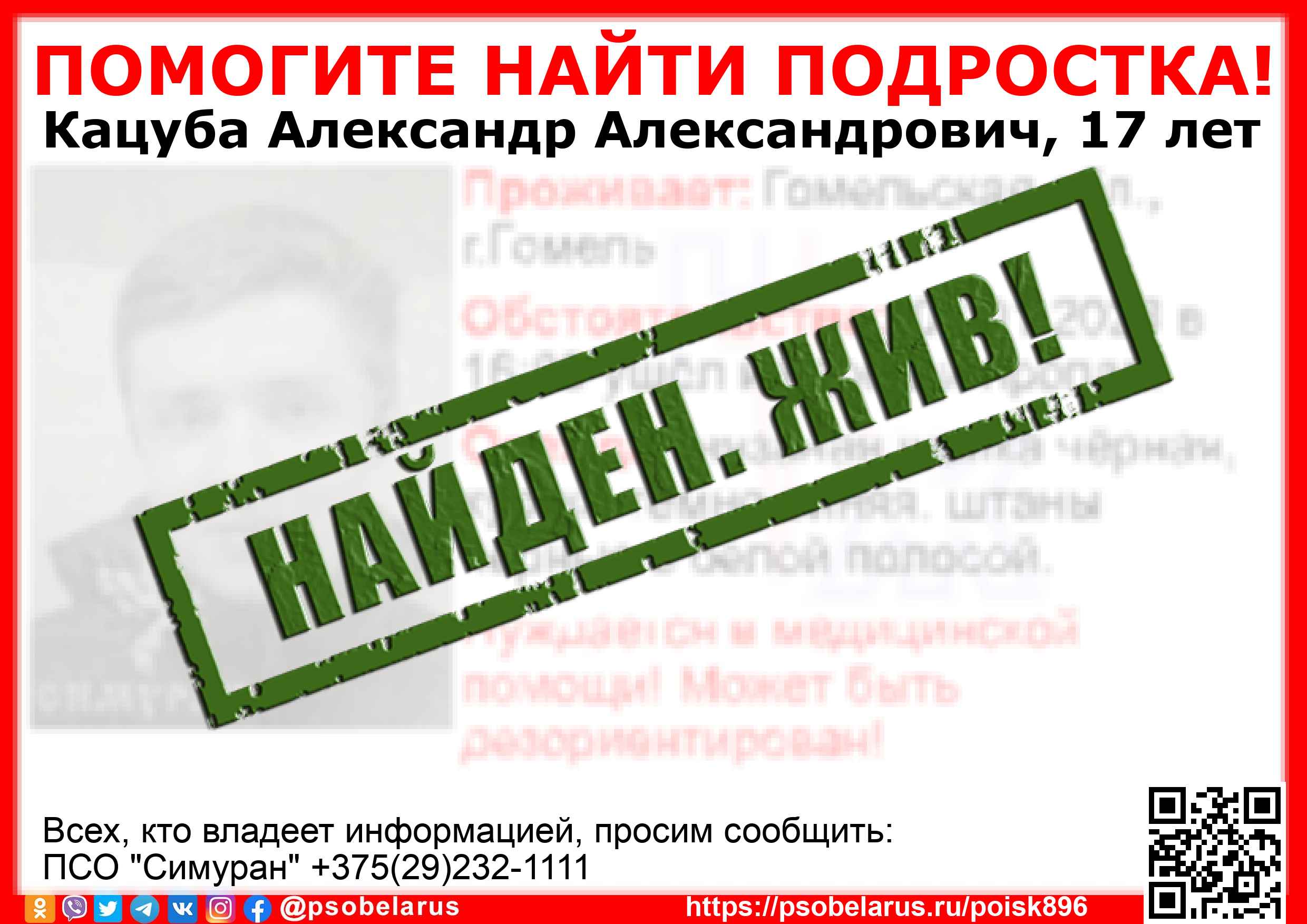 Всех, кто владеет информацией, просим сообщить: ПСО "Симуран" +375(29)232-1111 |