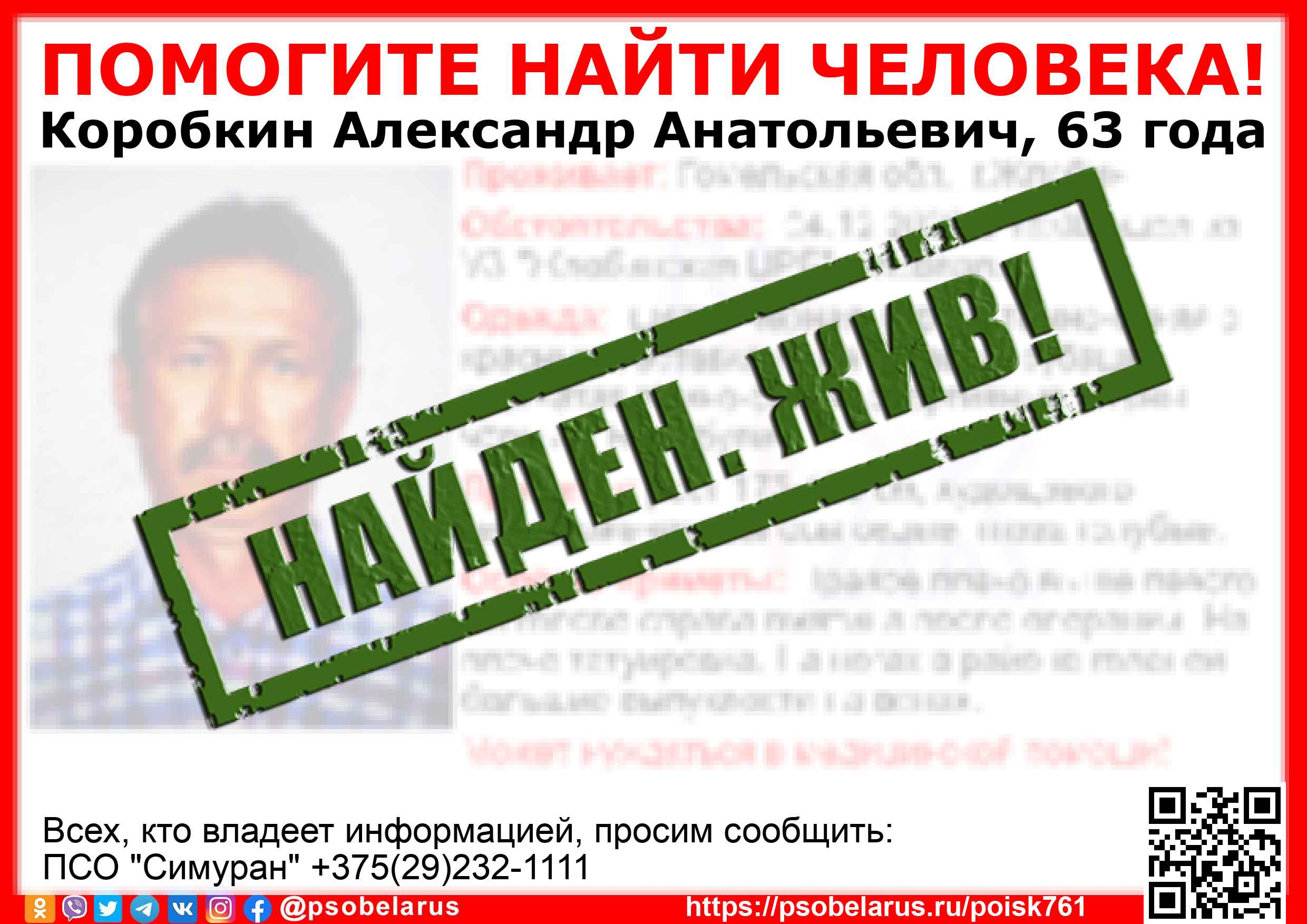 Всех, кто владеет информацией, просим сообщить: ПСО "Симуран" +375(29)232-1111 |