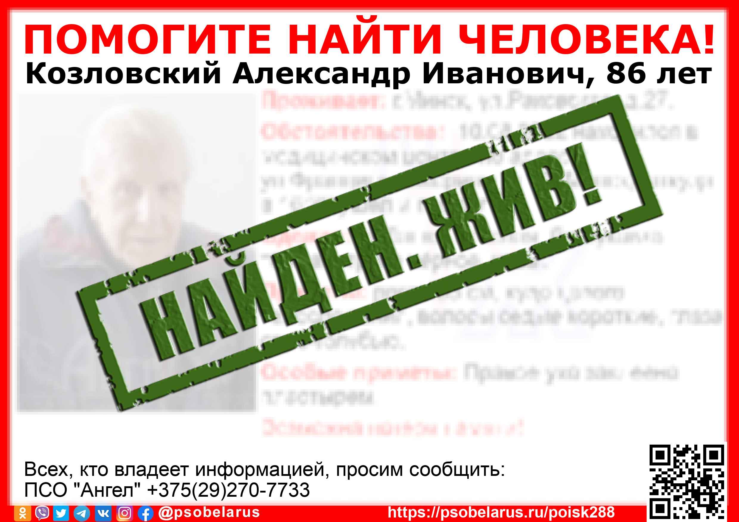 Всех, кто владеет информацией, просим сообщить: ПСО "Ангел" +375(29)270-7733 |