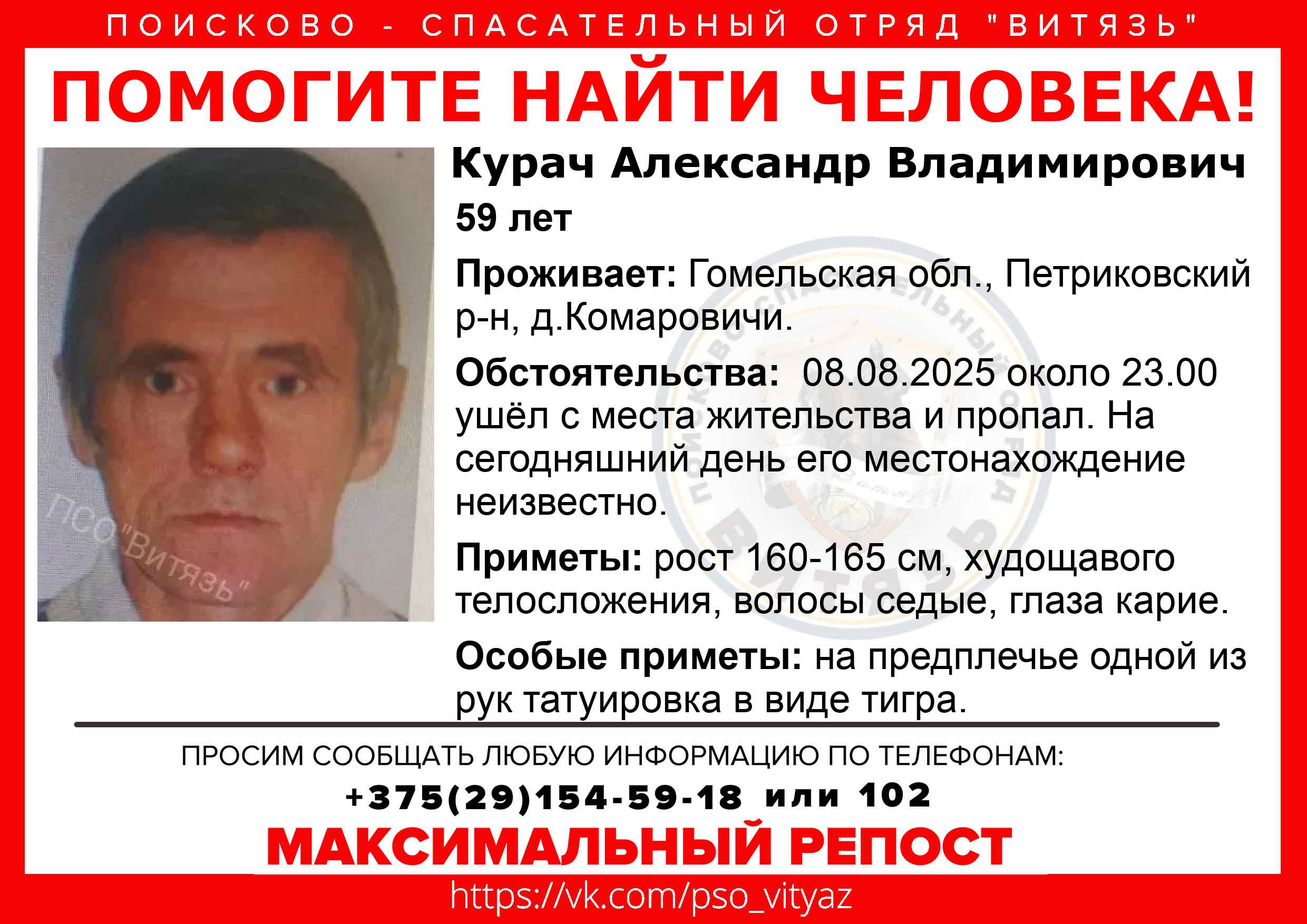 Всех, кто владеет информацией, просим сообщить: ПСО "ВИТЯЗЬ" +375(29)154-59-18 |