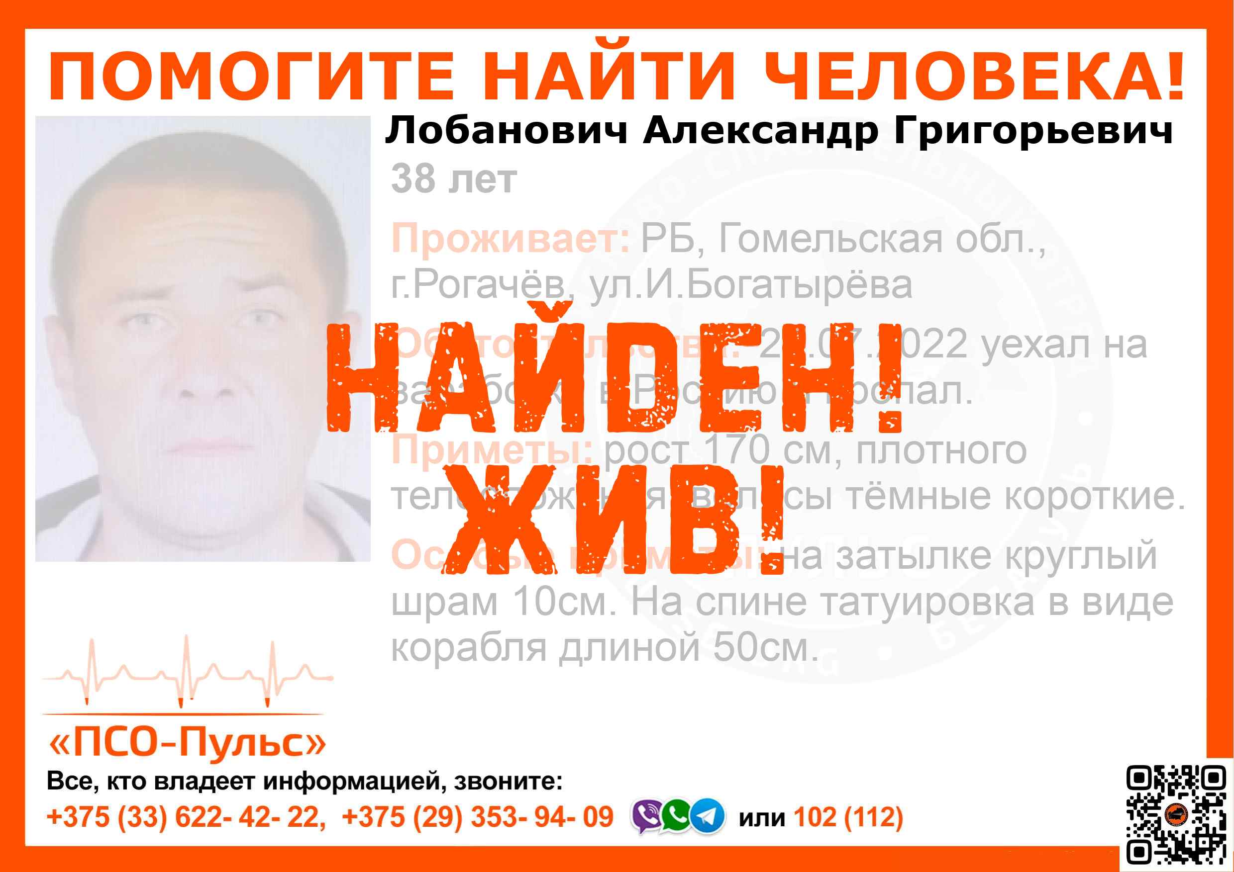 Всех, кто владеет информацией, просим сообщить: ПСО "ПСО-Пульс" +375(33)622-4222 |