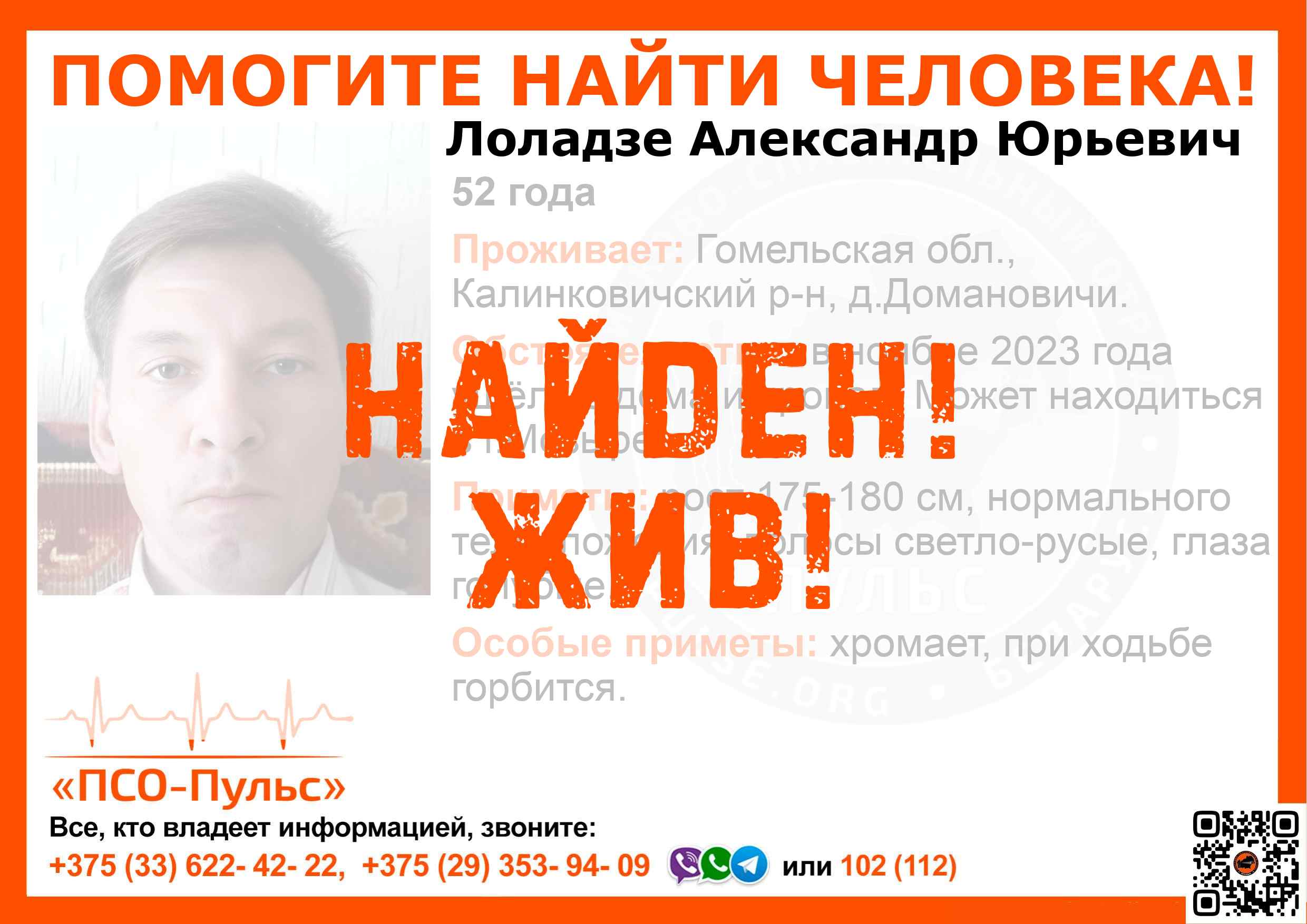 Всех, кто владеет информацией, просим сообщить: ПСО "ПСО-Пульс" +375(33)622-4222 |