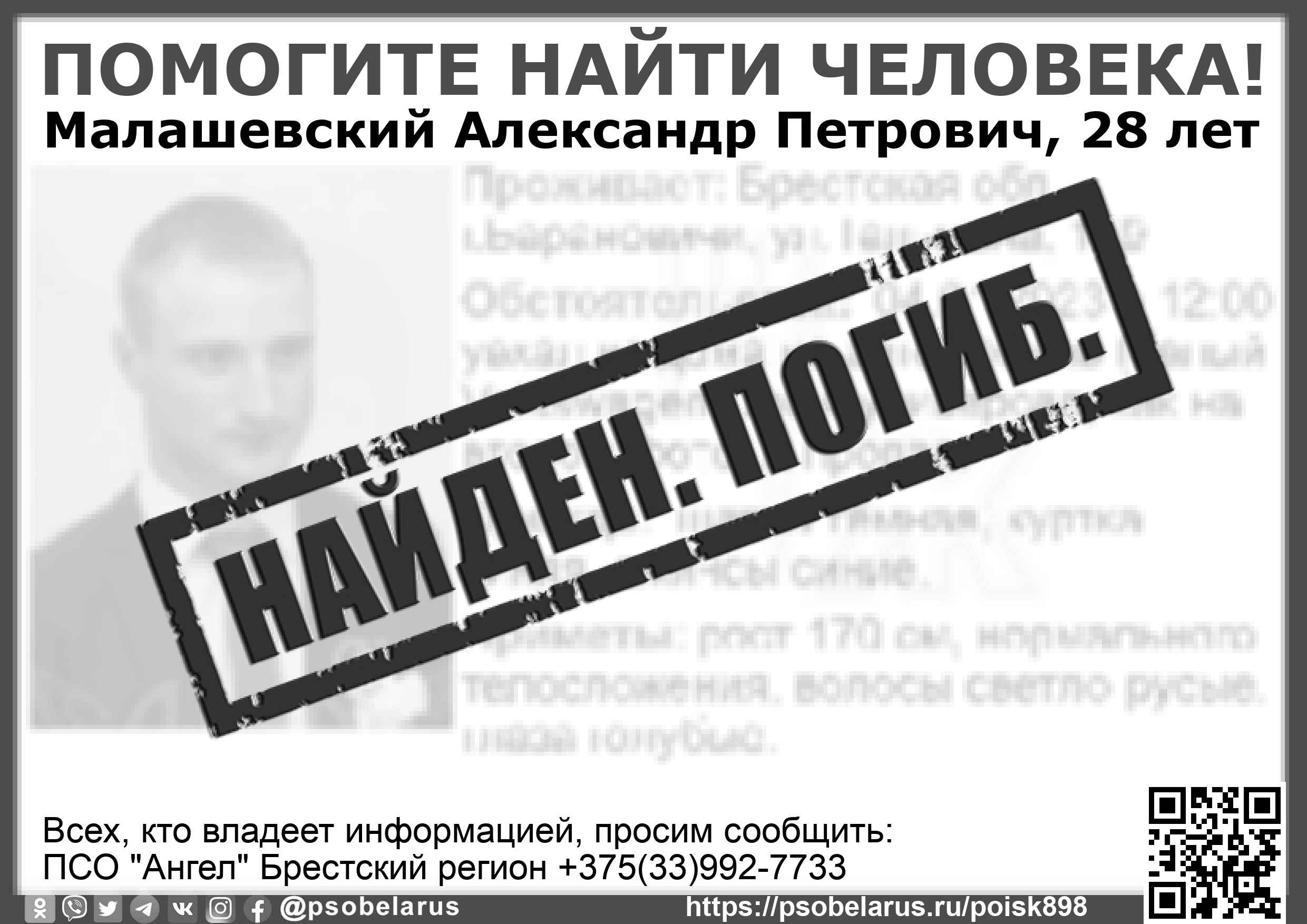 Всех, кто владеет информацией, просим сообщить: ПСО "Ангел" Брестский регион +375(33)992-7733 |