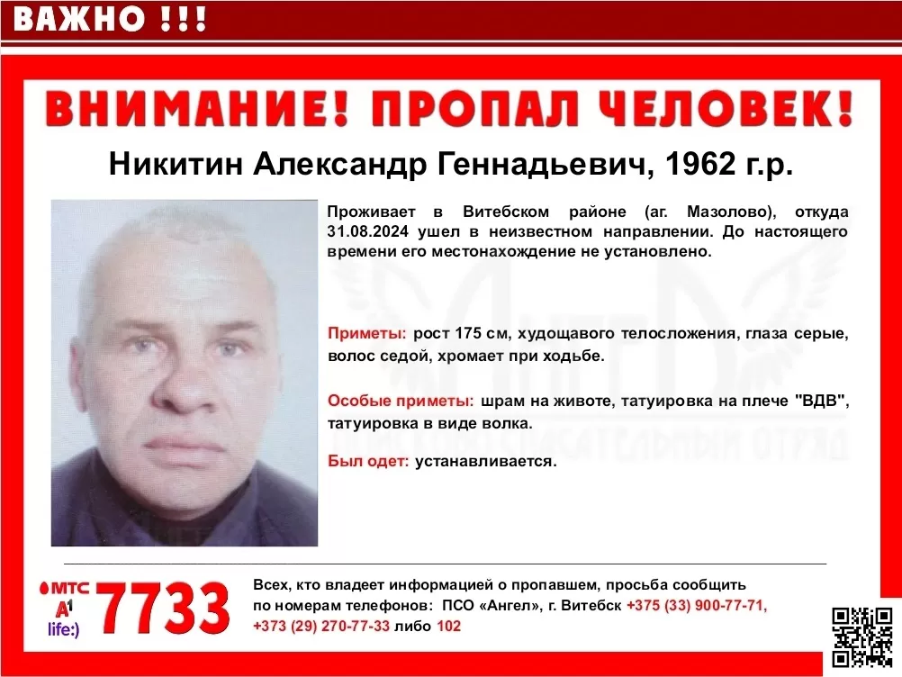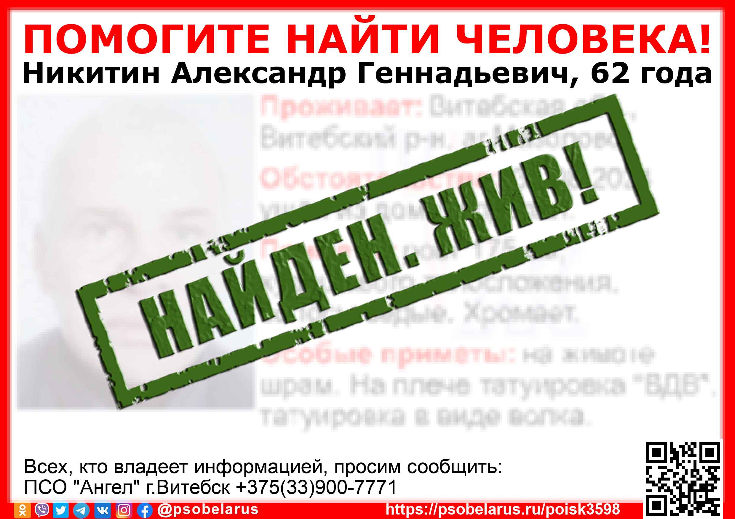 Всех, кто владеет информацией, просим сообщить: ПСО "Ангел" г.Витебск +375(33)900-7771 |