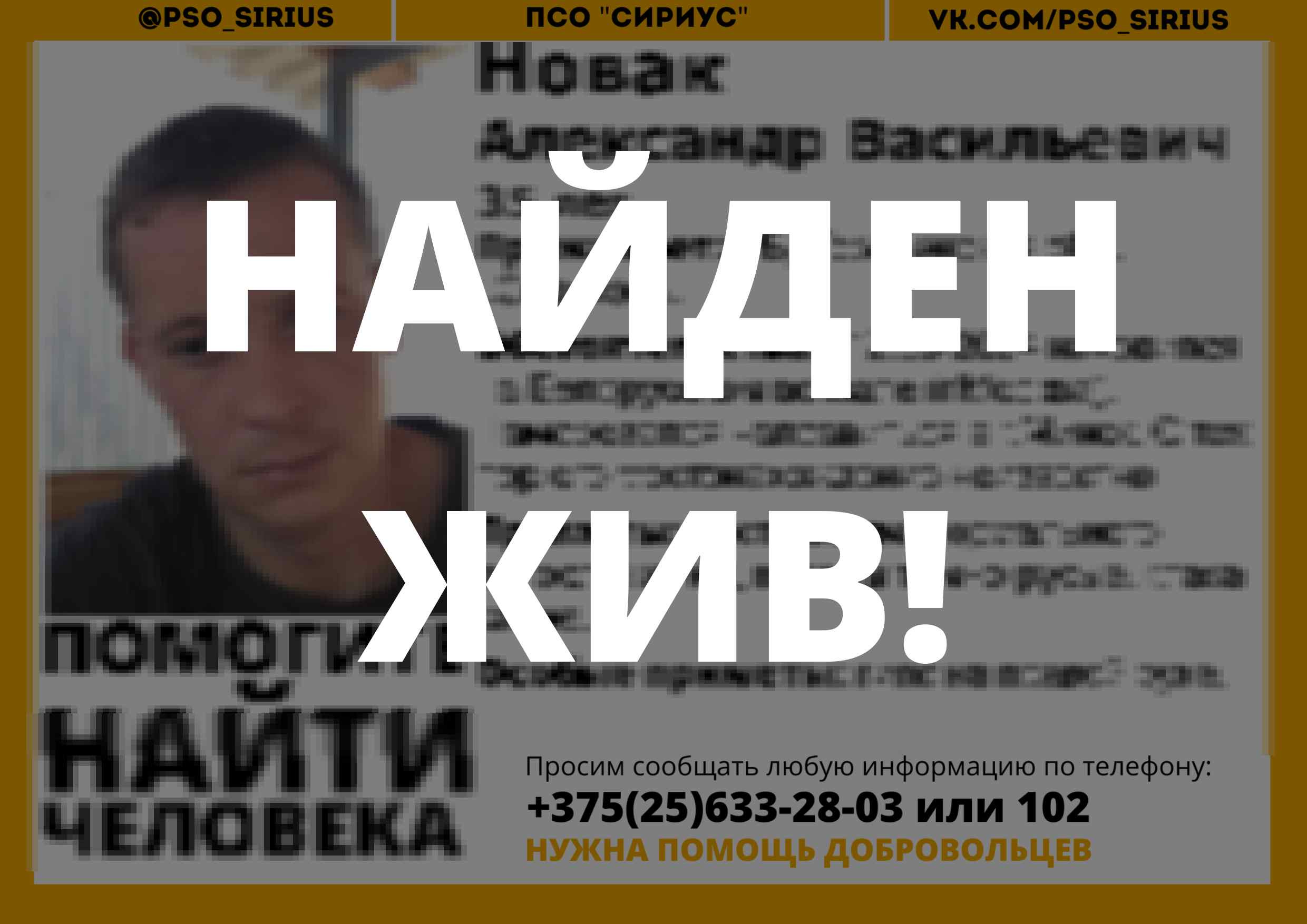 Всех, кто владеет информацией, просим сообщить: ПСО "Сириус" +375(25)633-28-03 |