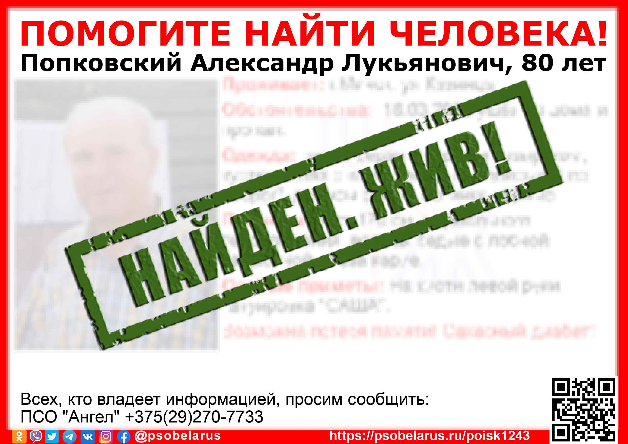Всех, кто владеет информацией, просим сообщить: ПСО "Ангел" +375(29)270-7733 |