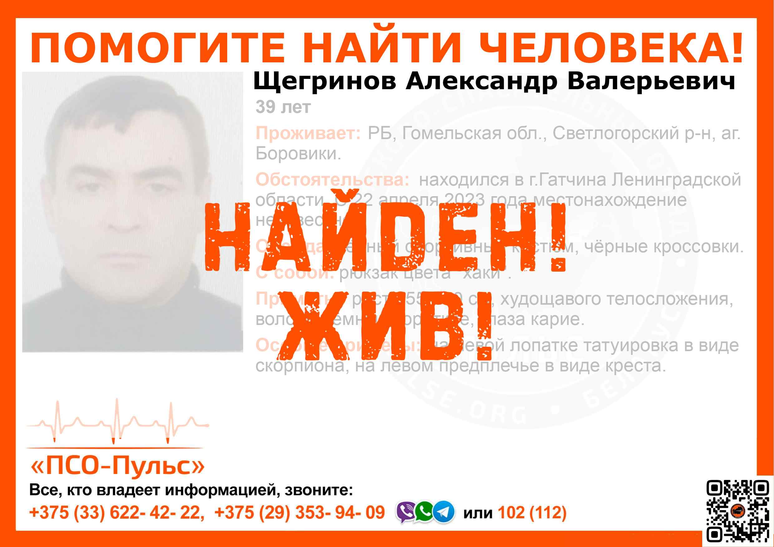 Всех, кто владеет информацией, просим сообщить: ПСО "ПСО-Пульс" +375(33)622-4222 |