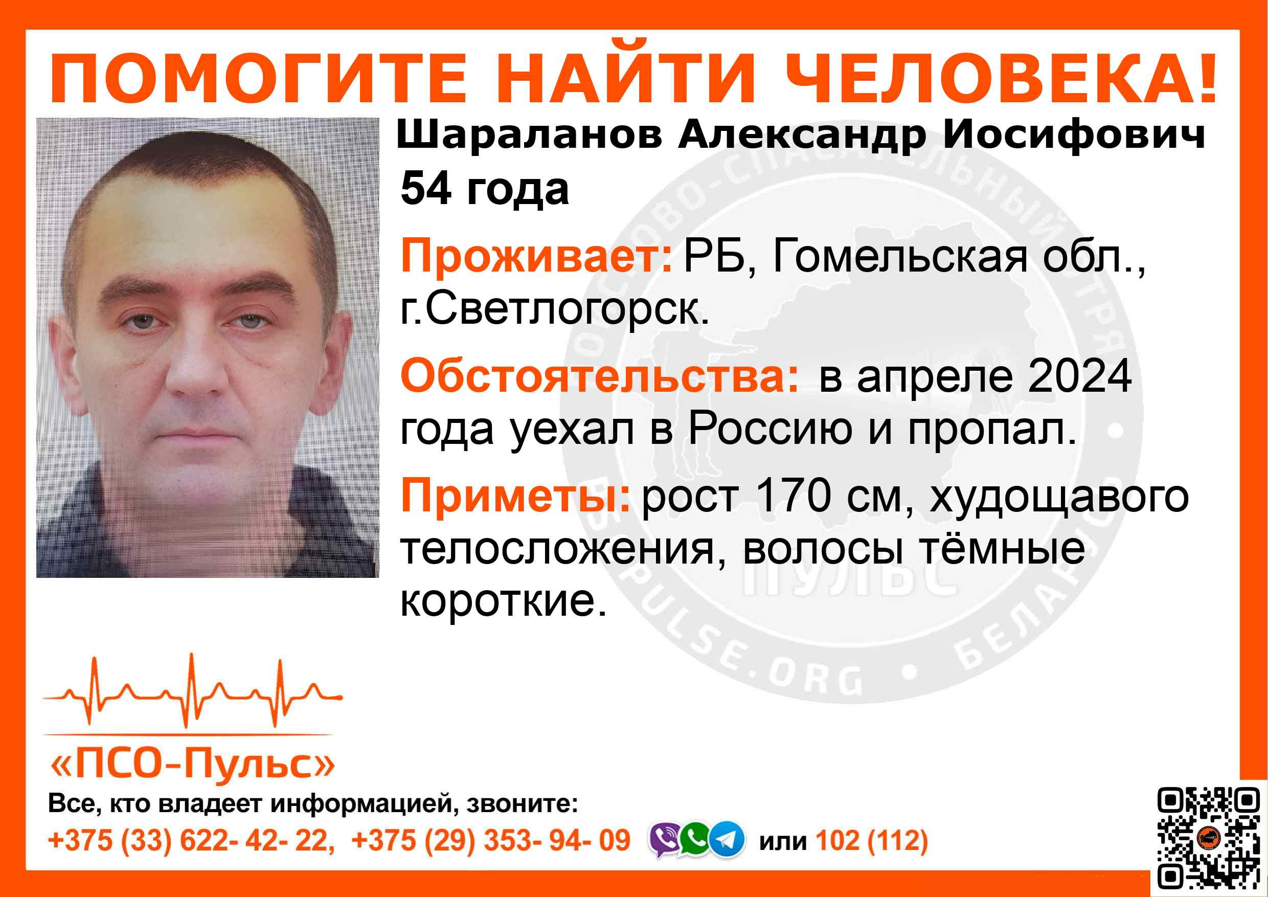 Всех, кто владеет информацией, просим сообщить: ПСО "ПСО-Пульс" +375(33)622-4222 |