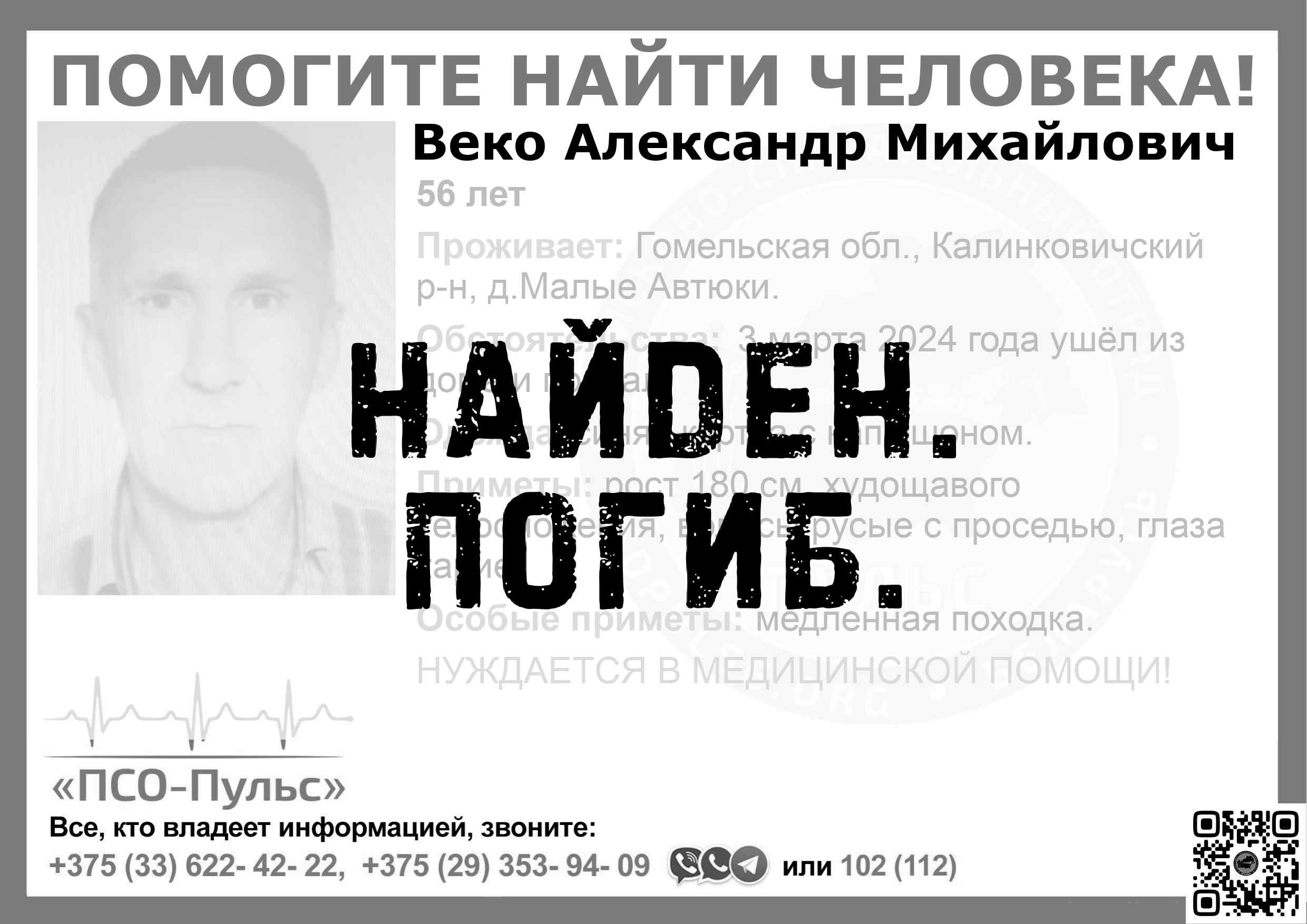 Всех, кто владеет информацией, просим сообщить: ПСО "ПСО-Пульс" +375(33)622-4222 |