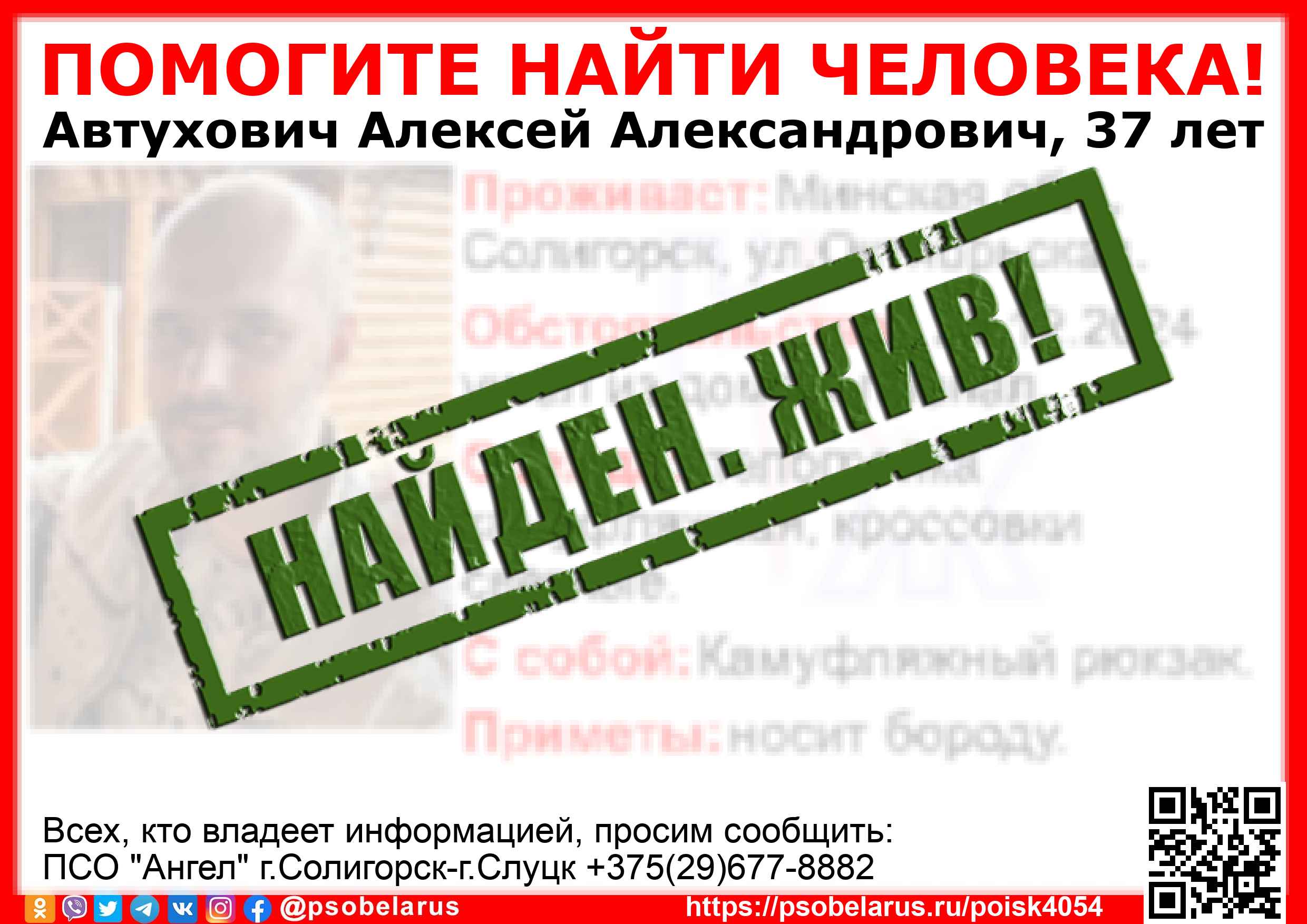 | Всех, кто владеет информацией, просим сообщить: ПСО "Ангел" г.Солигорск-г.Слуцк +375(29)677-8882 |  |