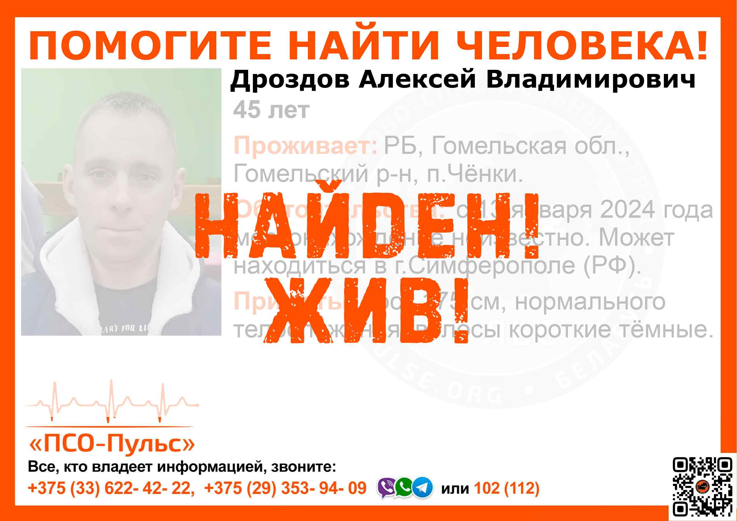 Всех, кто владеет информацией, просим сообщить: ПСО "ПСО-Пульс" +375(33)622-4222 |