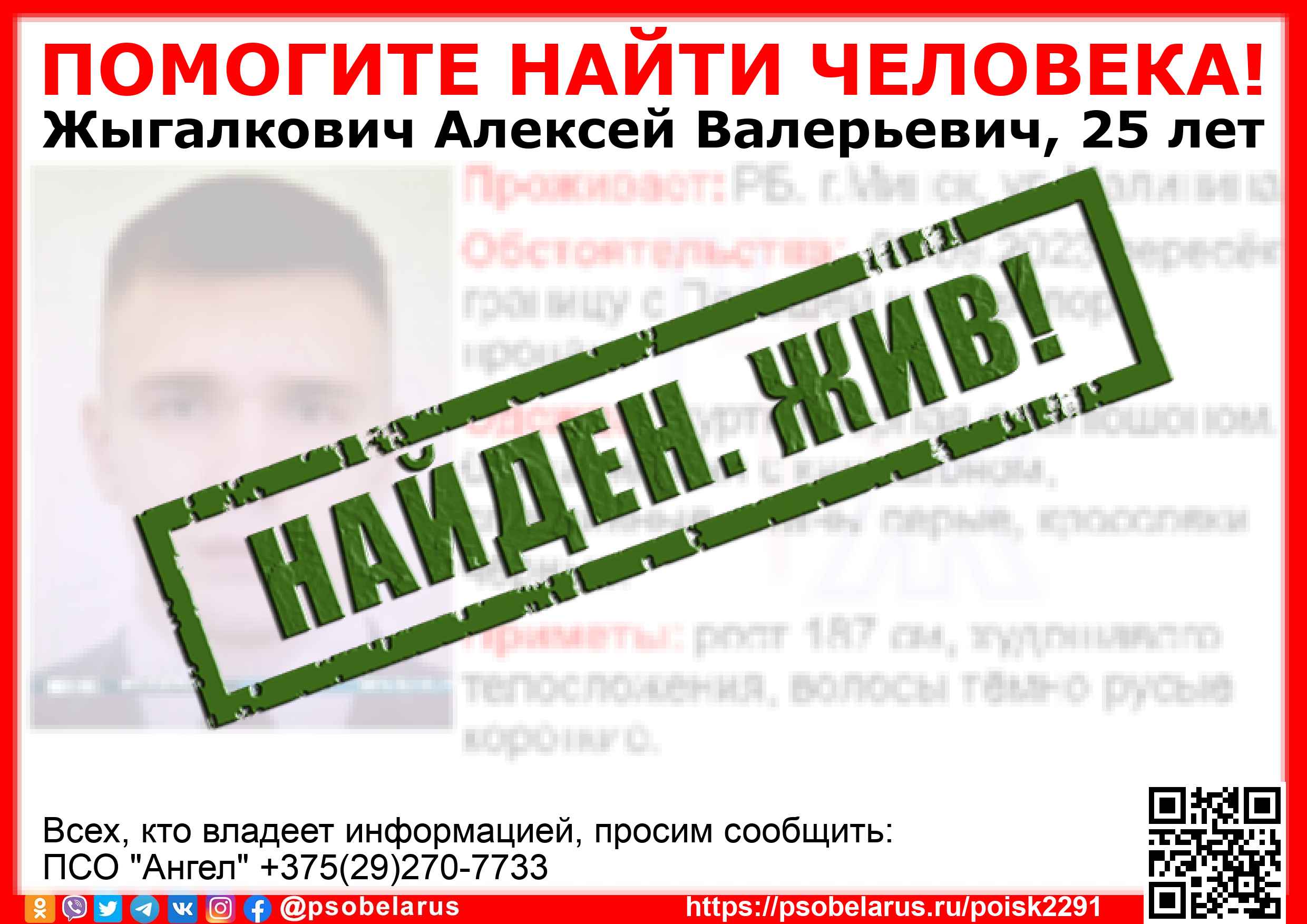Всех, кто владеет информацией, просим сообщить: ПСО "Ангел" +375(29)270-7733 |