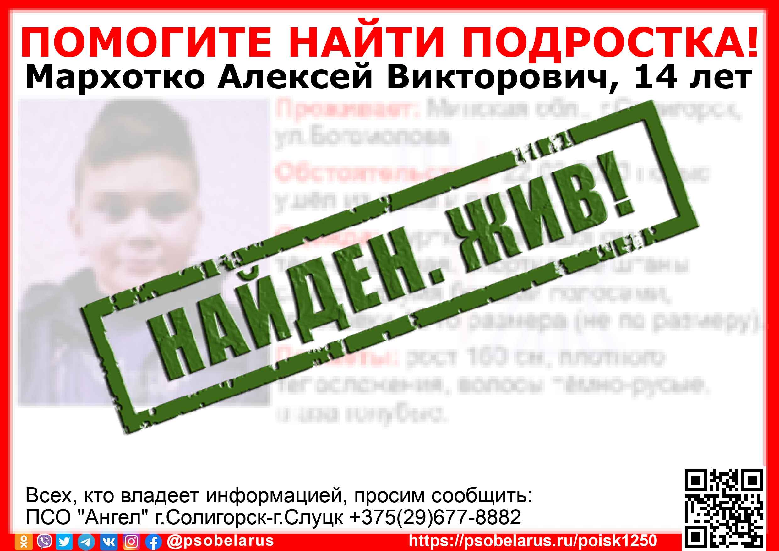 Всех, кто владеет информацией, просим сообщить: ПСО "Ангел" г.Солигорск-г.Слуцк +375(29)677-8882 |