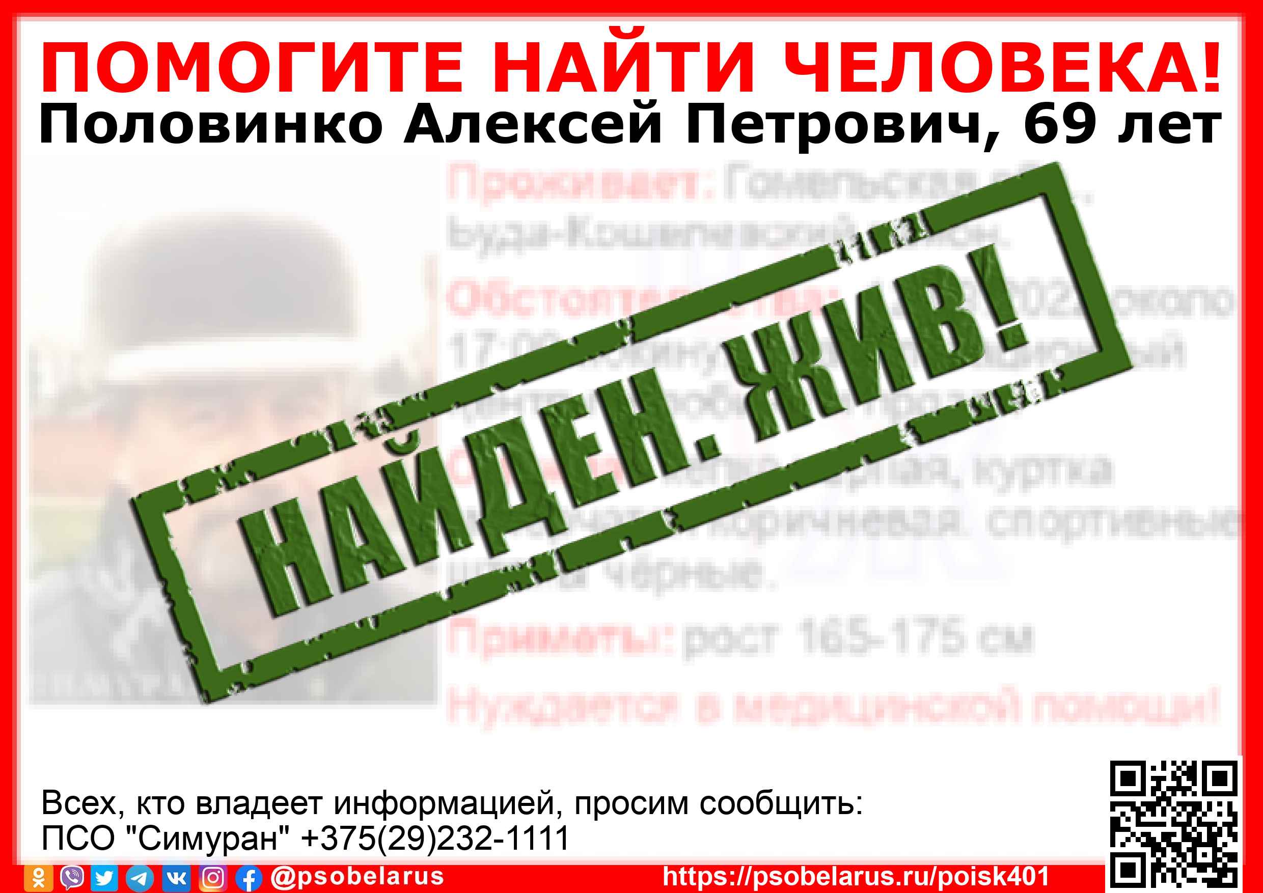 | Всех, кто владеет информацией, просим сообщить: ПСО "Симуран" +375(29)232-1111 |  |