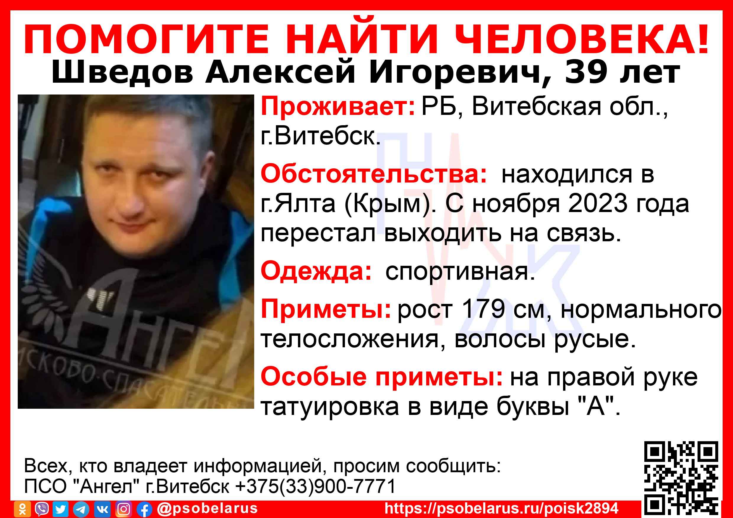 Всех, кто владеет информацией, просим сообщить: ПСО "Ангел" г.Витебск +375(33)900-7771 |