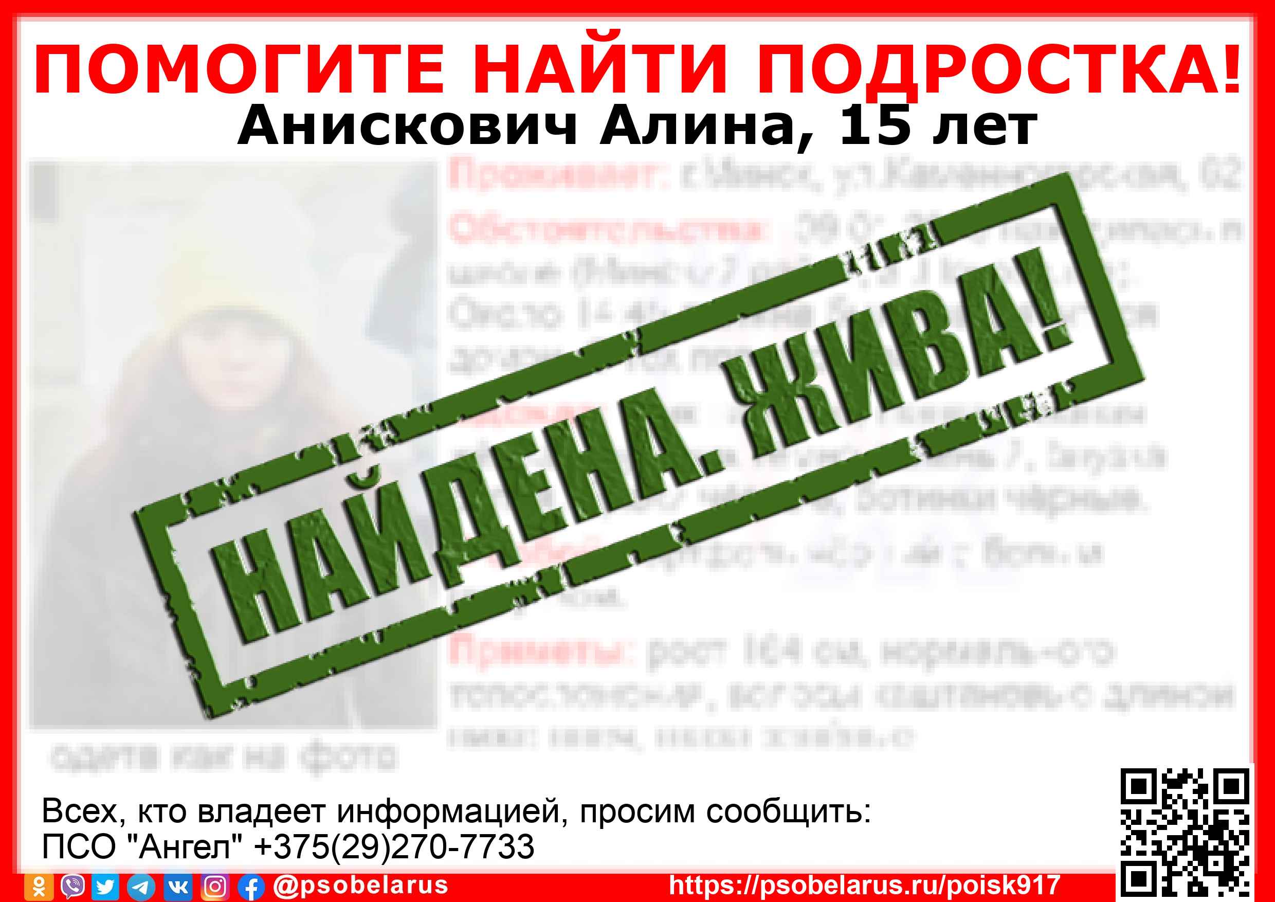 Всех, кто владеет информацией, просим сообщить: ПСО "Ангел" +375(29)270-7733 |