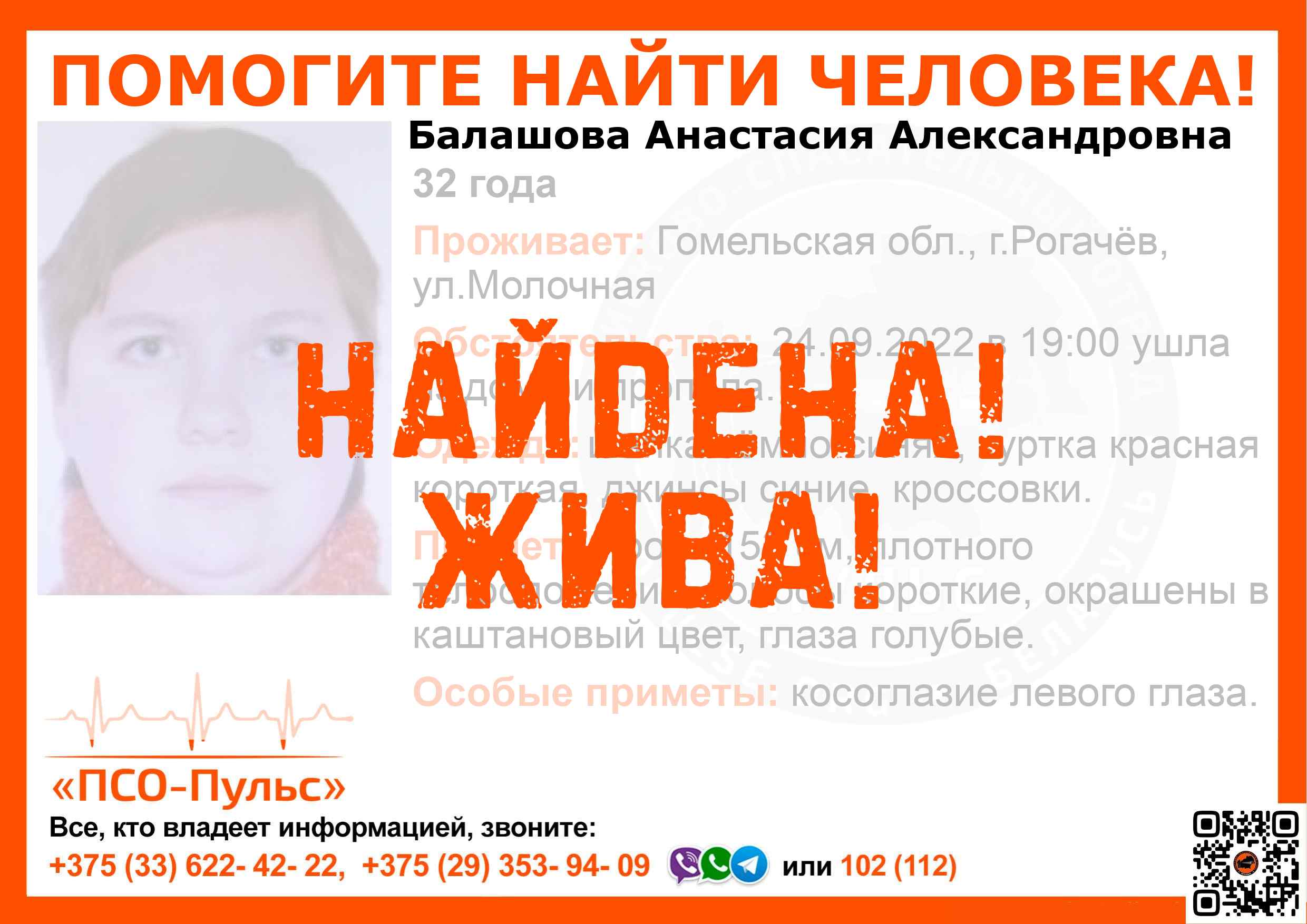 Всех, кто владеет информацией, просим сообщить: ПСО "ПСО-Пульс" +375(33)622-4222 |