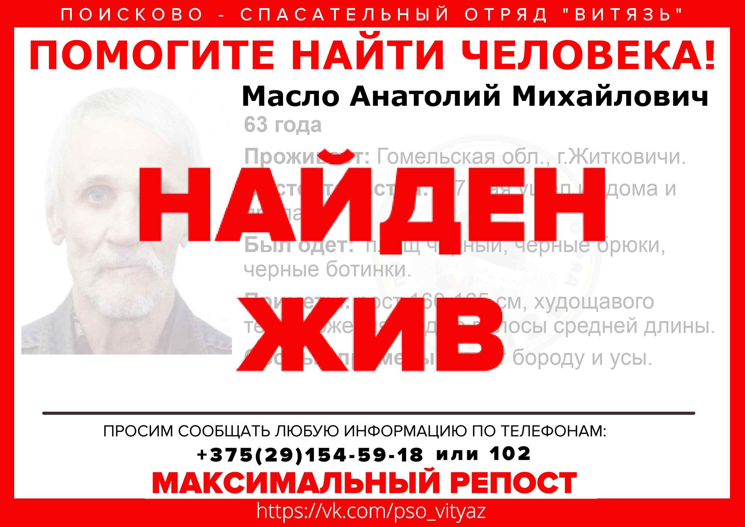 Всех, кто владеет информацией, просим сообщить: ПСО "ВИТЯЗЬ" +375(29)154-59-18 |