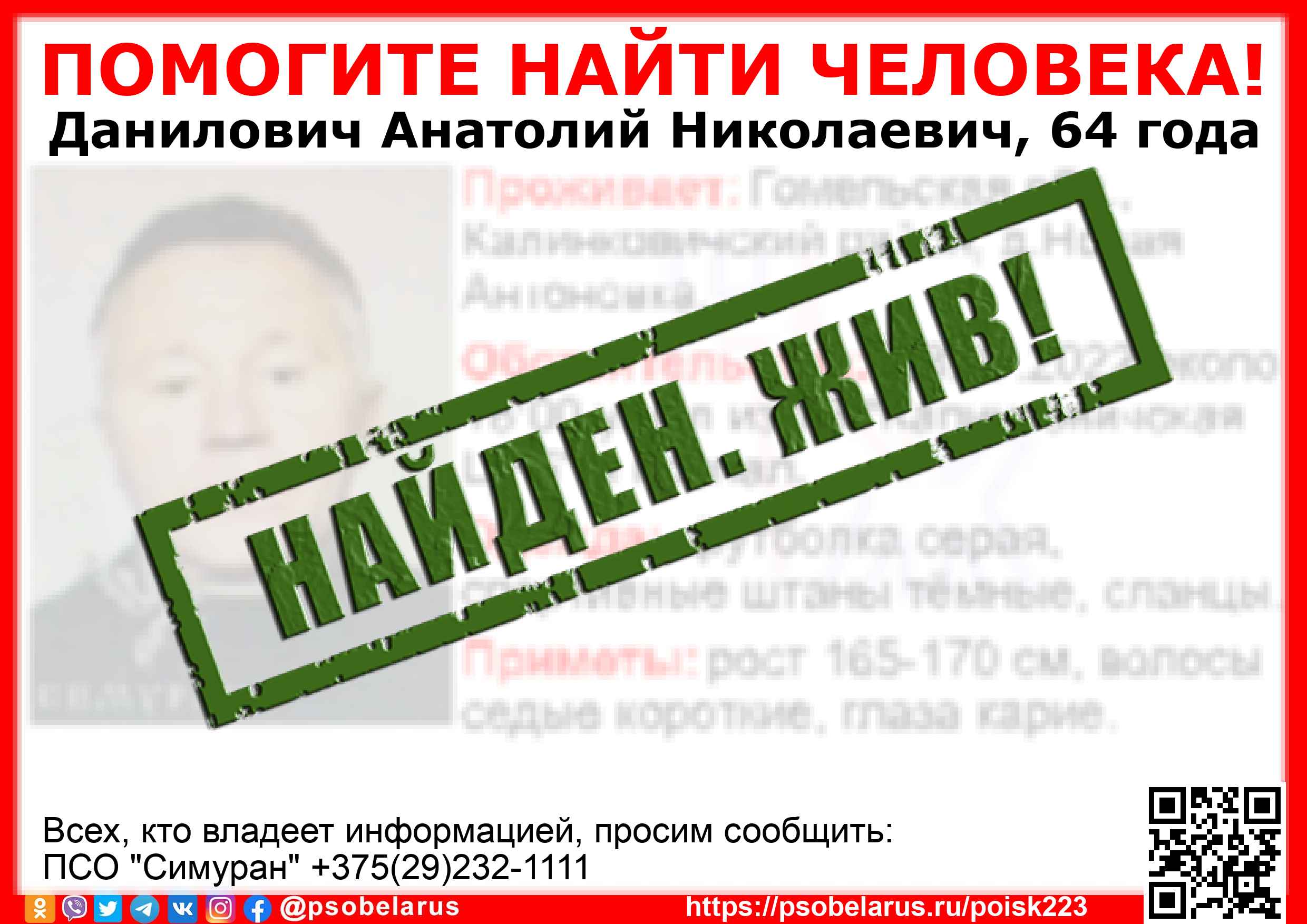 Всех, кто владеет информацией, просим сообщить: ПСО "Симуран" +375(29)232-1111 |