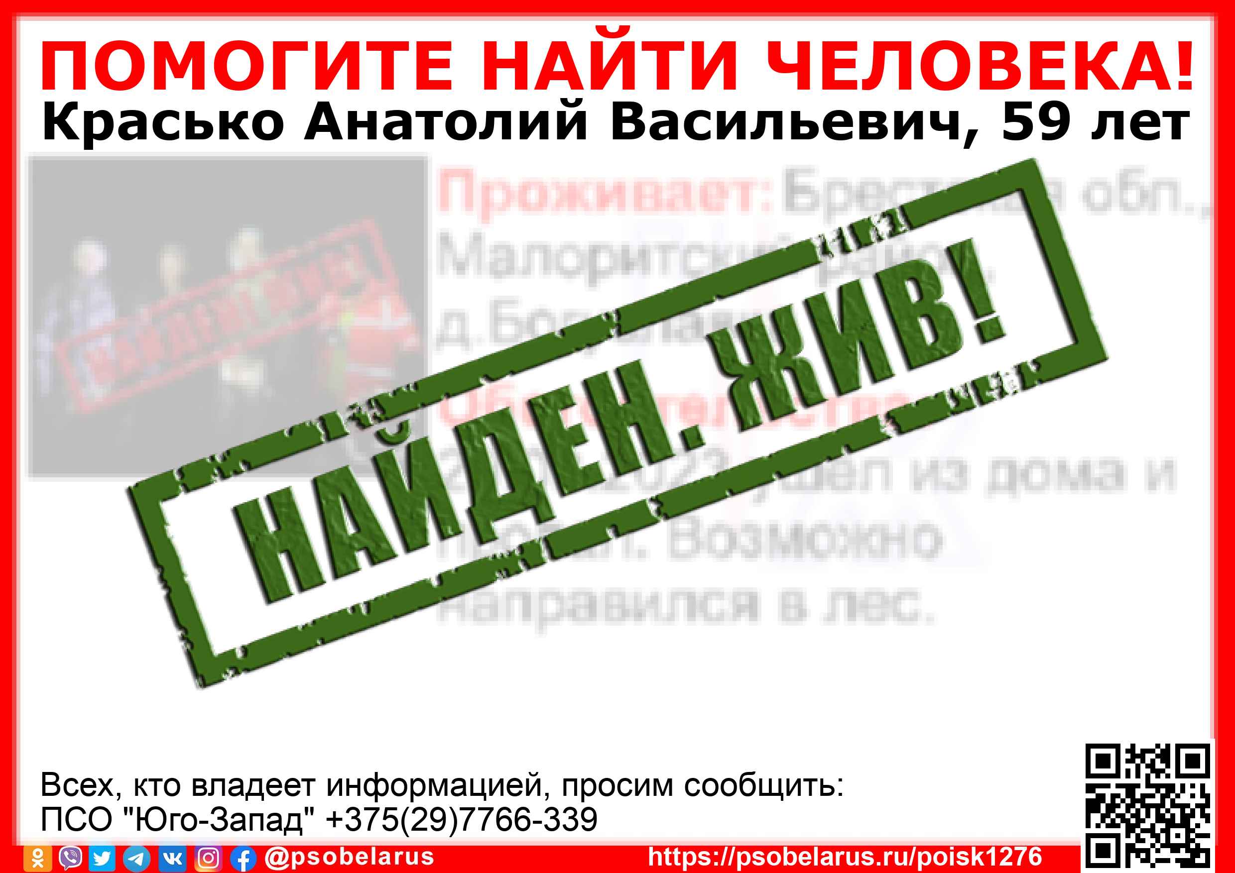 Всех, кто владеет информацией, просим сообщить: ПСО "Юго-Запад" +375(29)7766-339 |