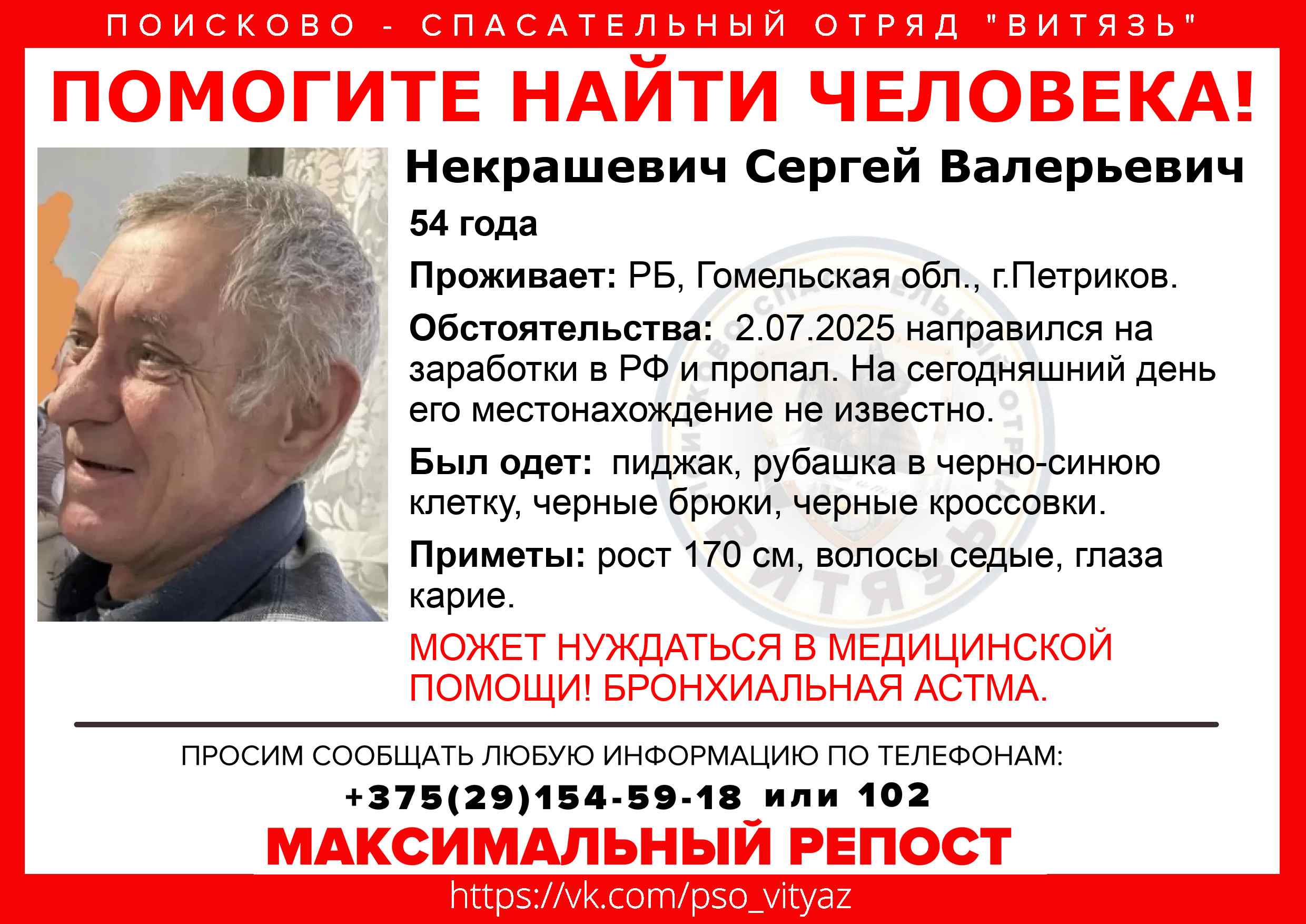 Всех, кто владеет информацией, просим сообщить: ПСО "ВИТЯЗЬ" +375(29)154-59-18 |