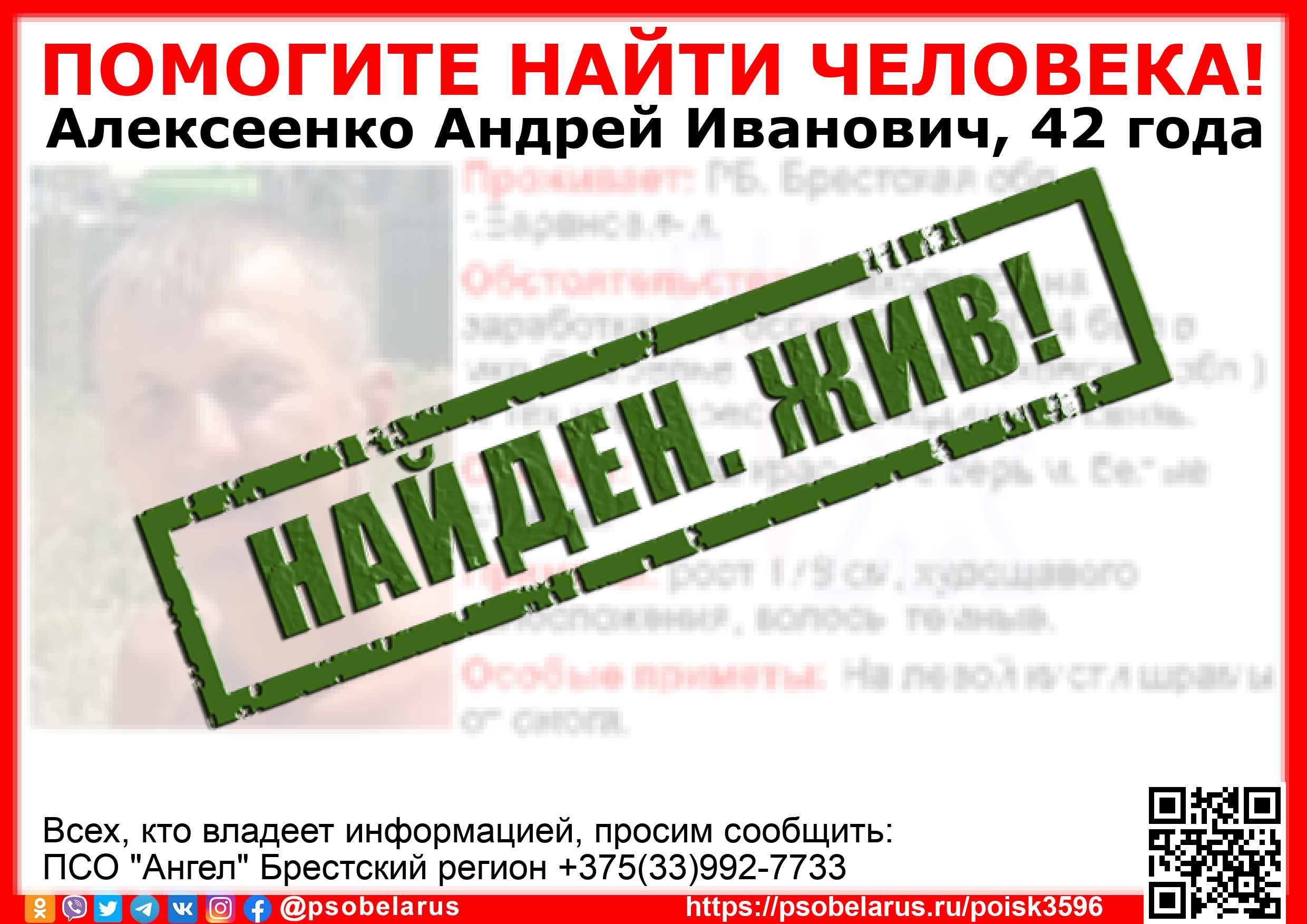 Всех, кто владеет информацией, просим сообщить: ПСО "Ангел" Брестский регион +375(33)992-7733 |