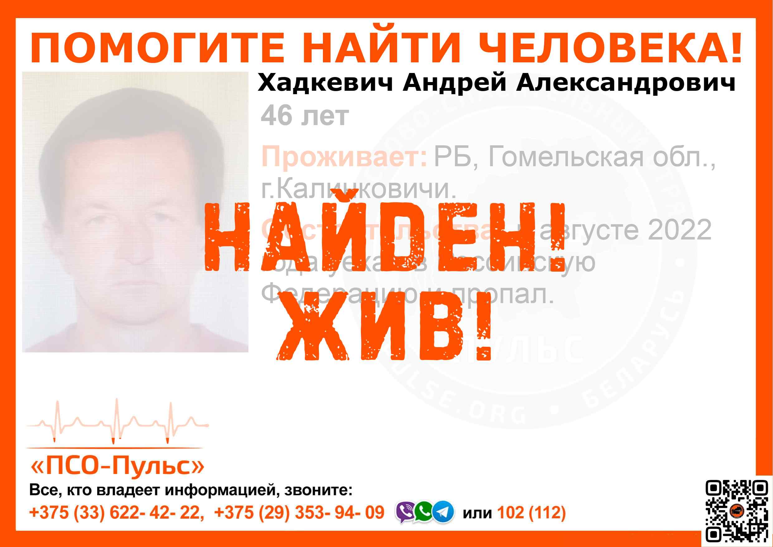 Всех, кто владеет информацией, просим сообщить: ПСО "ПСО-Пульс" +375(33)622-4222 |