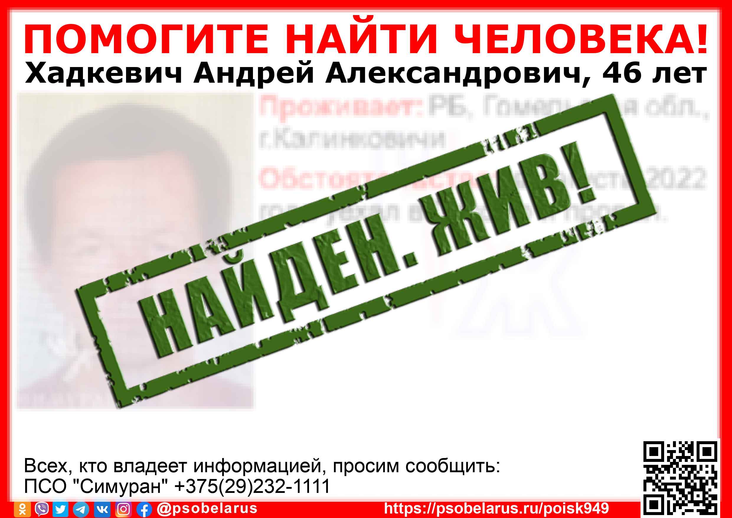 Всех, кто владеет информацией, просим сообщить: ПСО "Симуран" +375(29)232-1111 |
