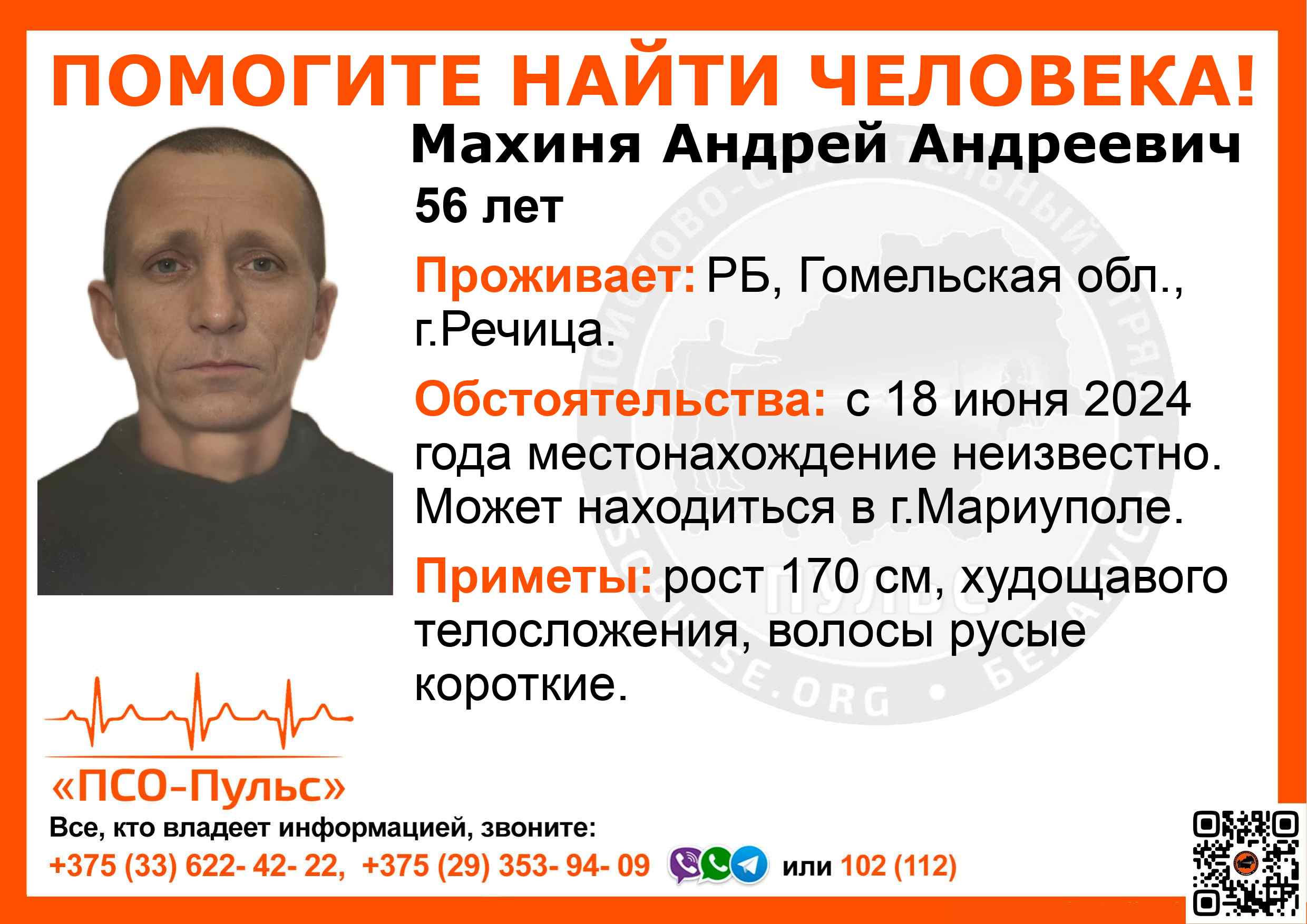 Всех, кто владеет информацией, просим сообщить: ПСО "ПСО-Пульс" +375(33)622-4222 |