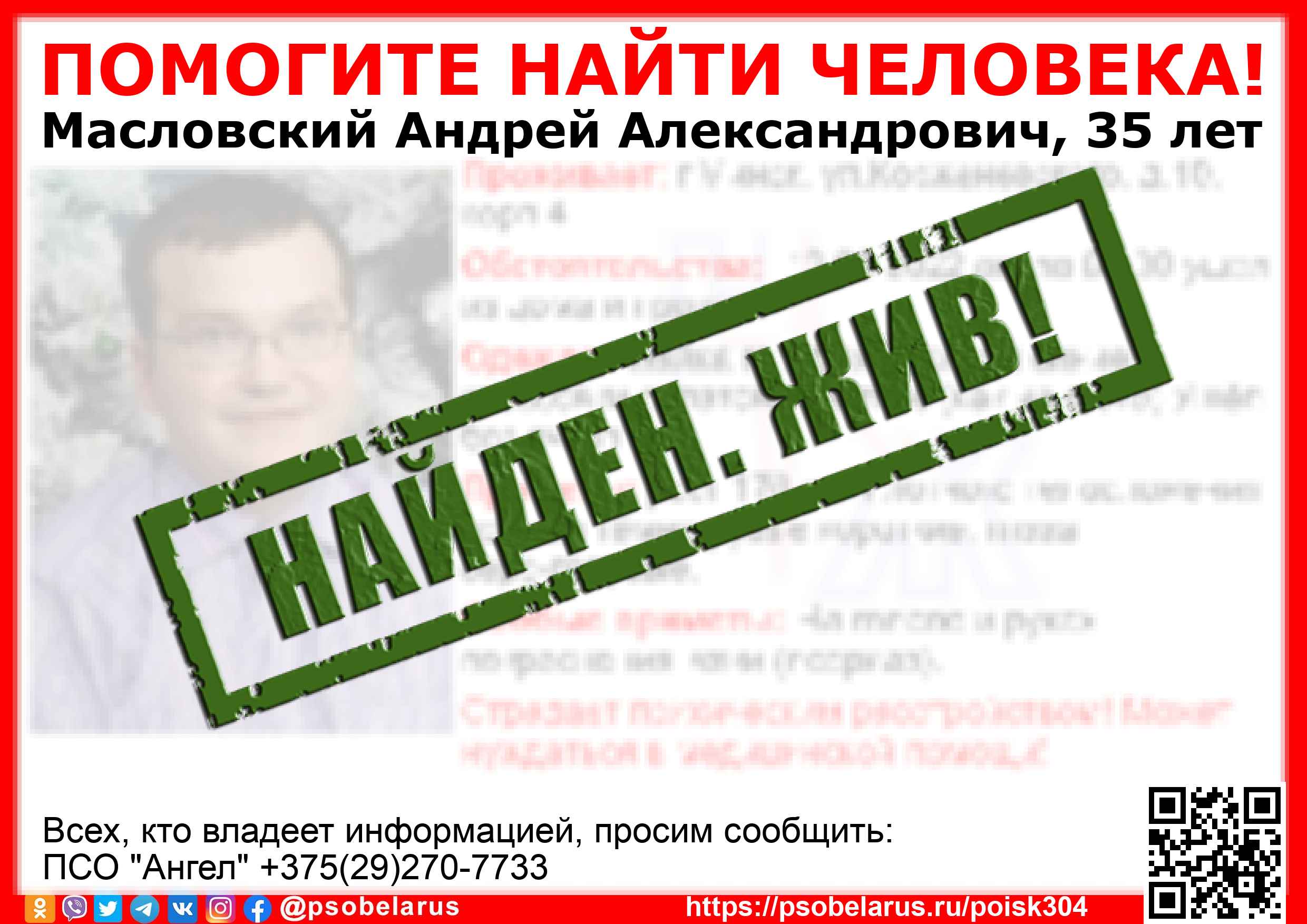 Всех, кто владеет информацией, просим сообщить: ПСО "Ангел" +375(29)270-7733 |