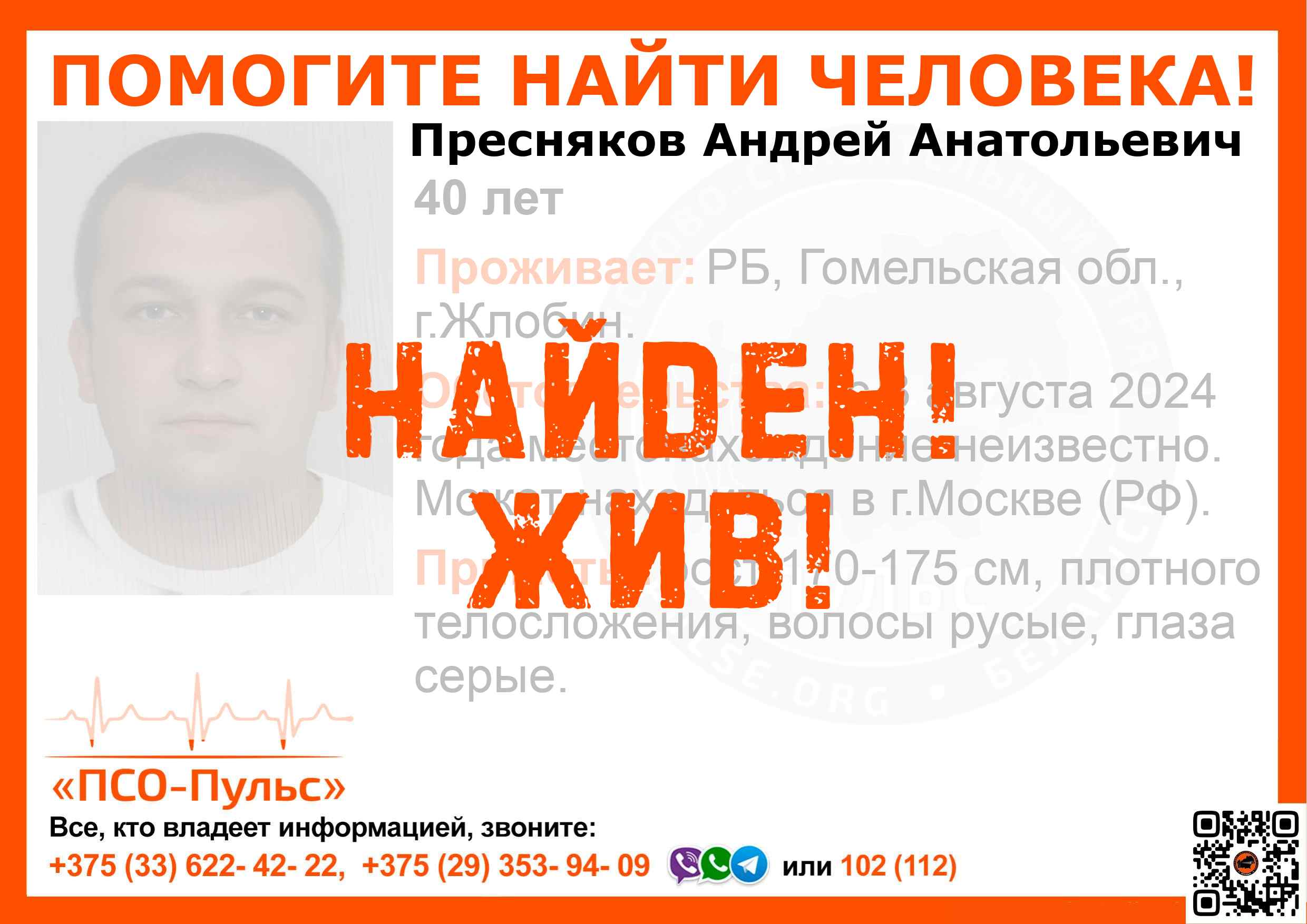 Всех, кто владеет информацией, просим сообщить: ПСО "ПСО-Пульс" +375(33)622-4222 |