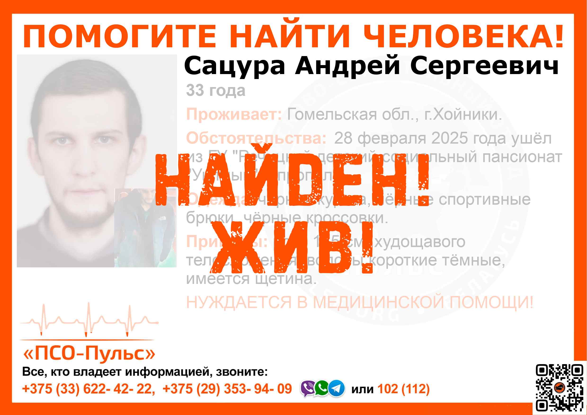 Всех, кто владеет информацией, просим сообщить: ПСО "ПСО-Пульс" +375(33)622-4222 |