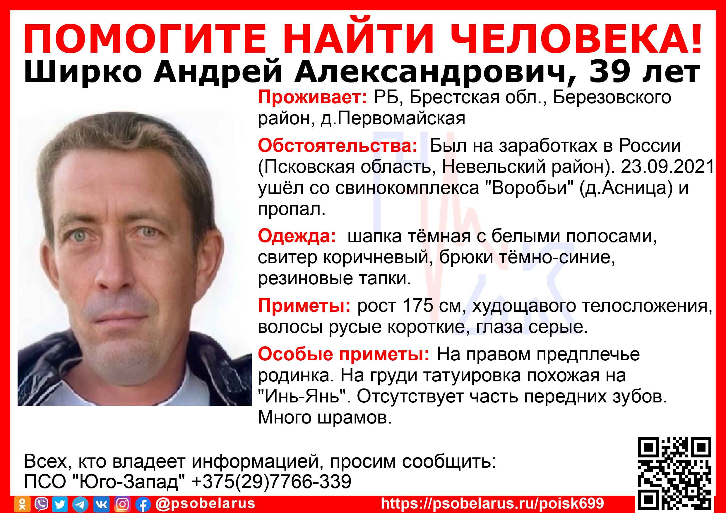 Был на заработках в России (Псковская область, Невельский район). 23.09.2021 ушёл со свинокомплекса "Воробьи" (д.Асница) и пропал.