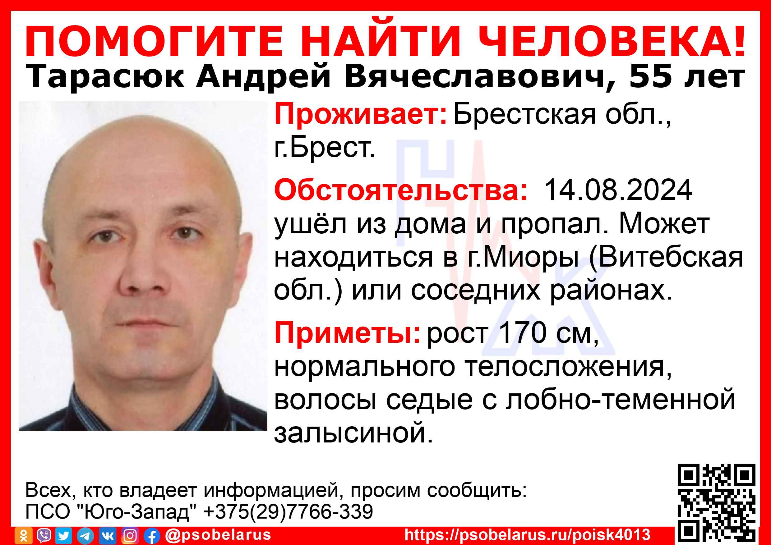 Всех, кто владеет информацией, просим сообщить: ПСО "Юго-Запад" +375(29)7766-339 |