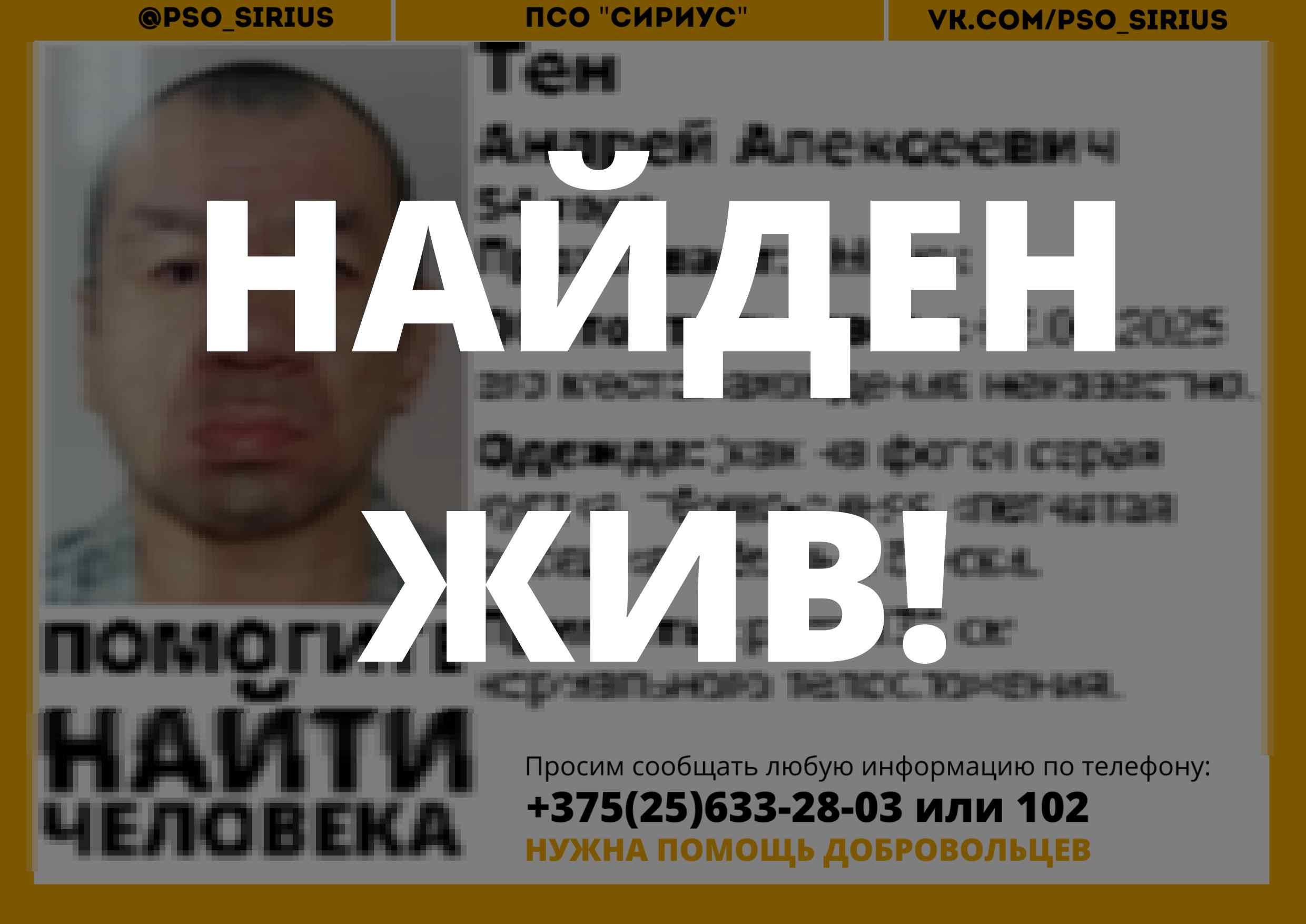 Всех, кто владеет информацией, просим сообщить: ПСО "Сириус" +375(25)633-28-03 |