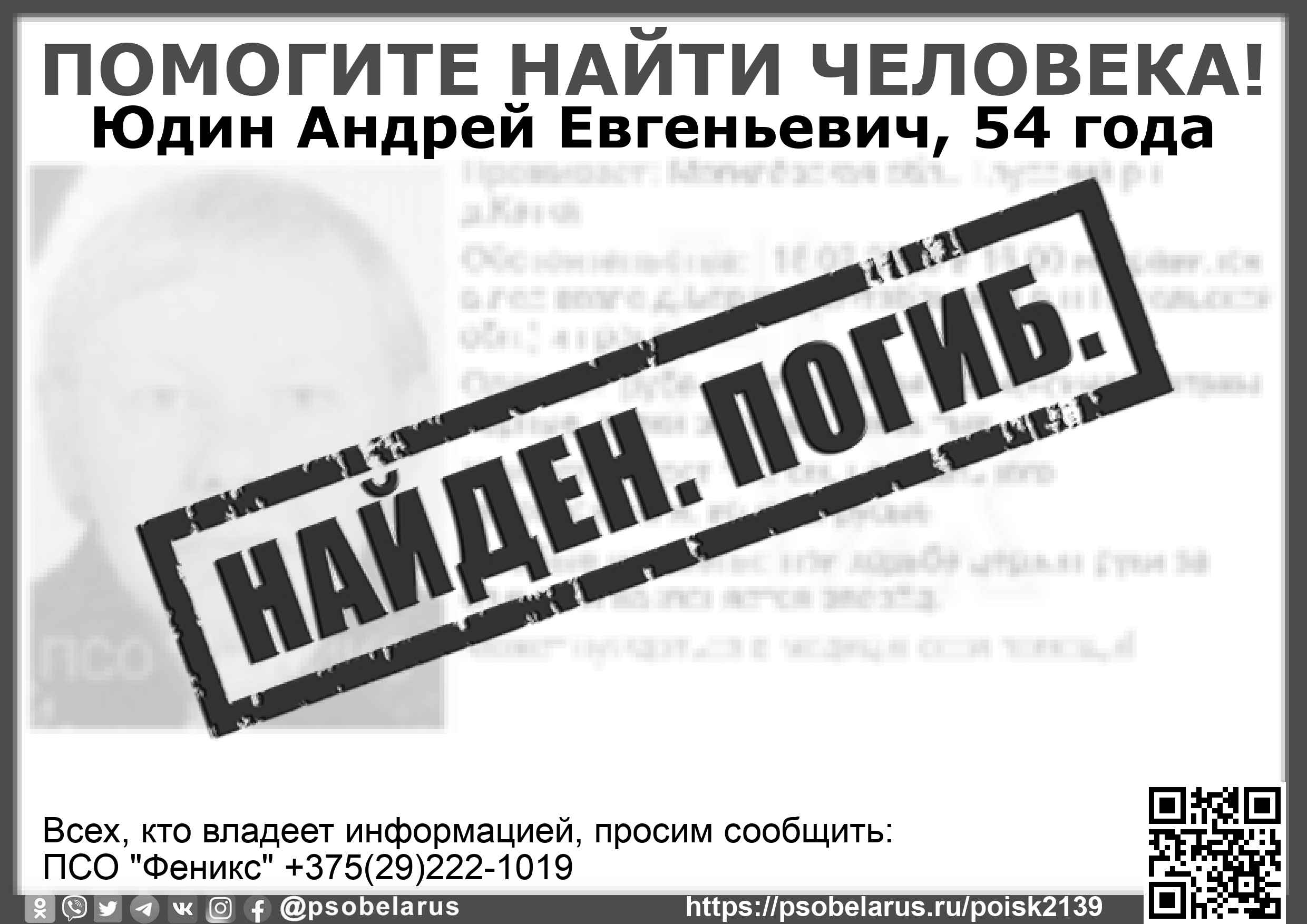 Всех, кто владеет информацией, просим сообщить: ПСО "Феникс" +375(29)222-1019 |