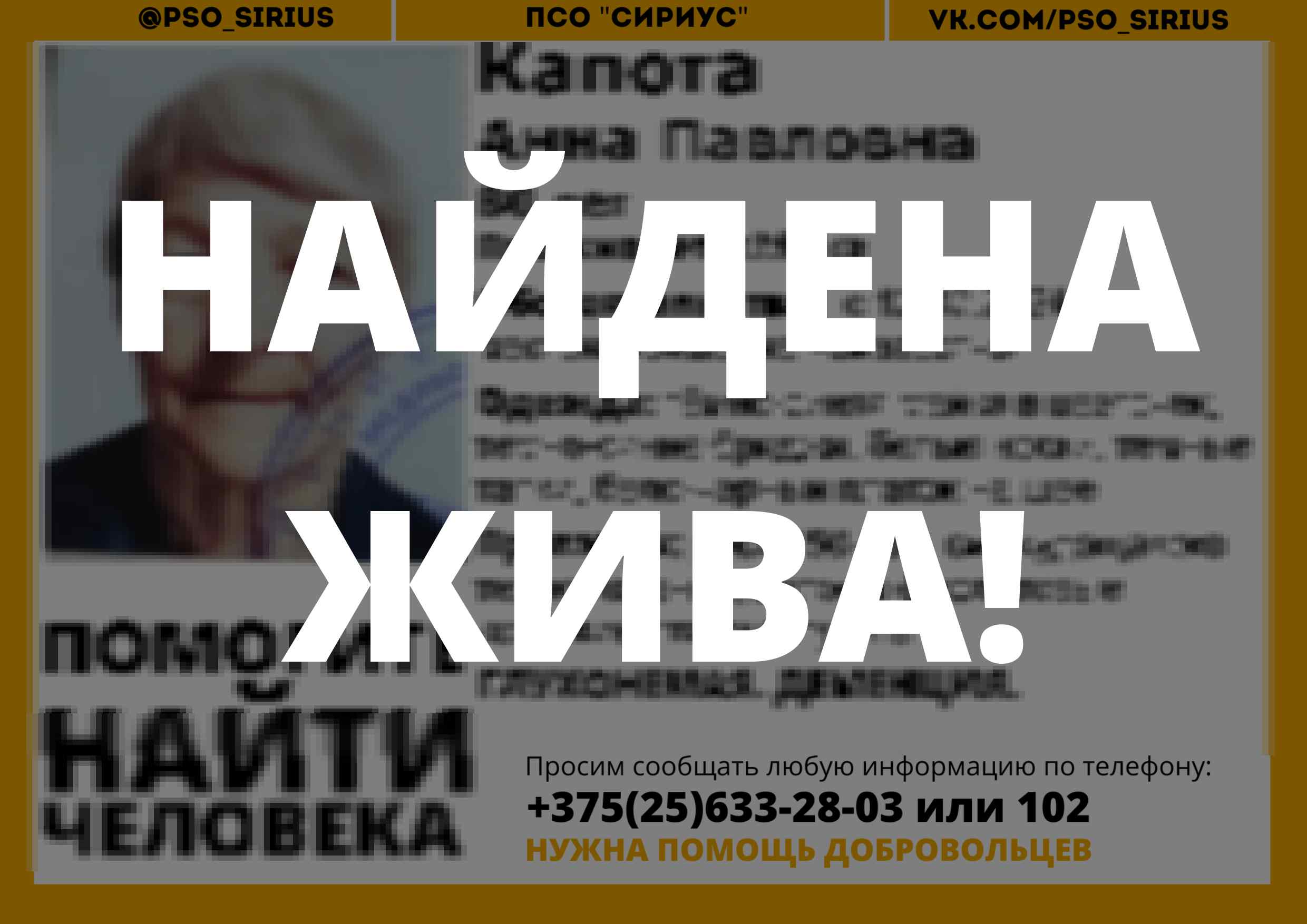 Всех, кто владеет информацией, просим сообщить: ПСО "Сириус" +375(25)633-28-03 |