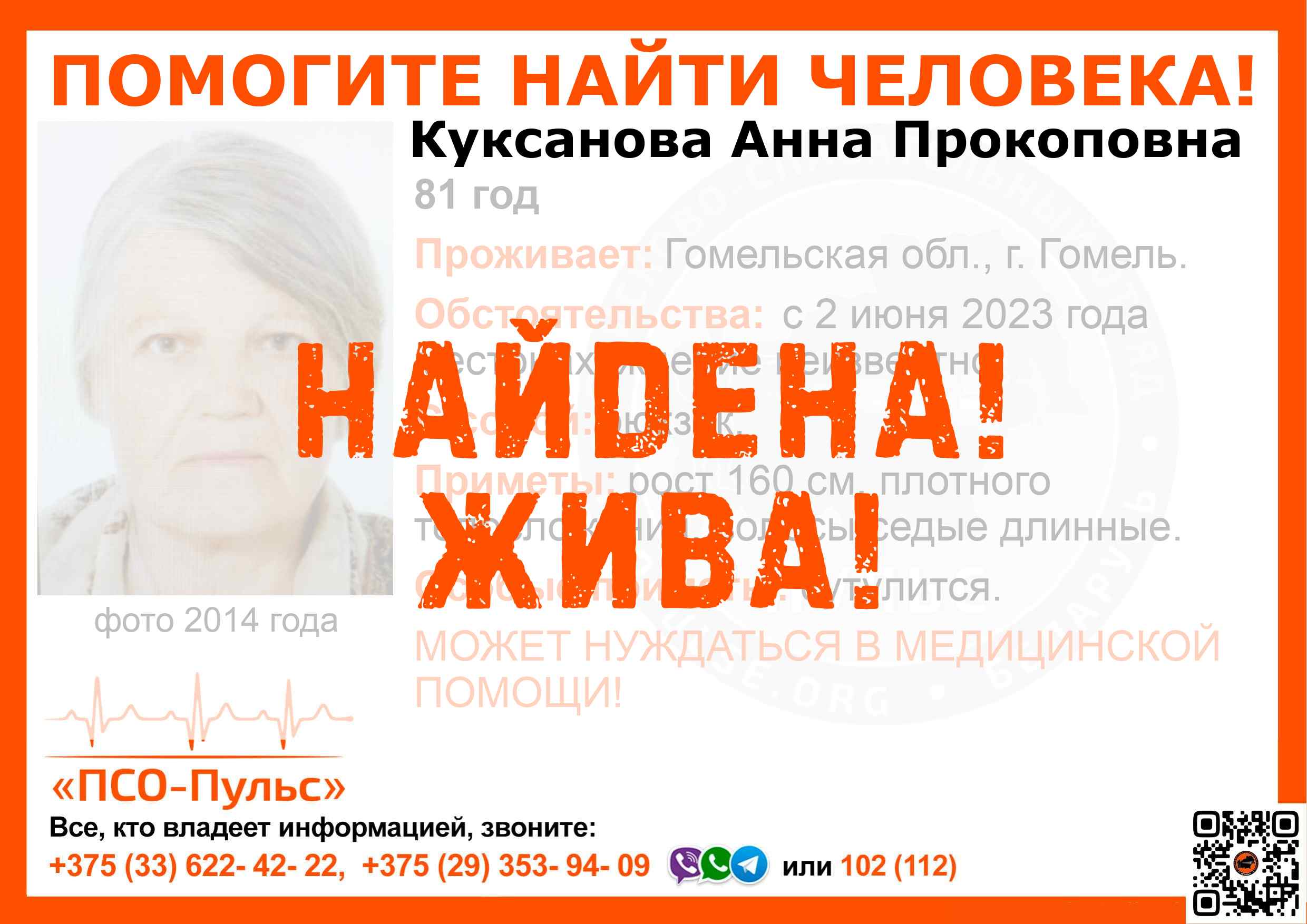 Всех, кто владеет информацией, просим сообщить: ПСО "ПСО-Пульс" +375(33)622-4222 |