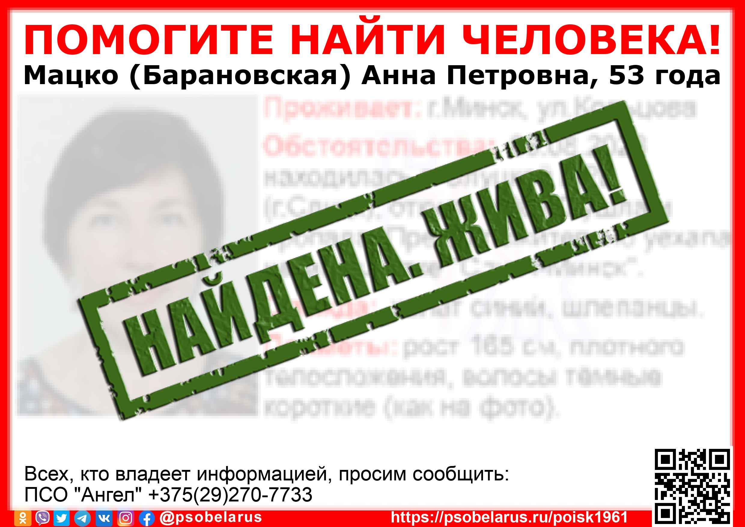 Всех, кто владеет информацией, просим сообщить: ПСО "Ангел" +375(29)270-7733 |