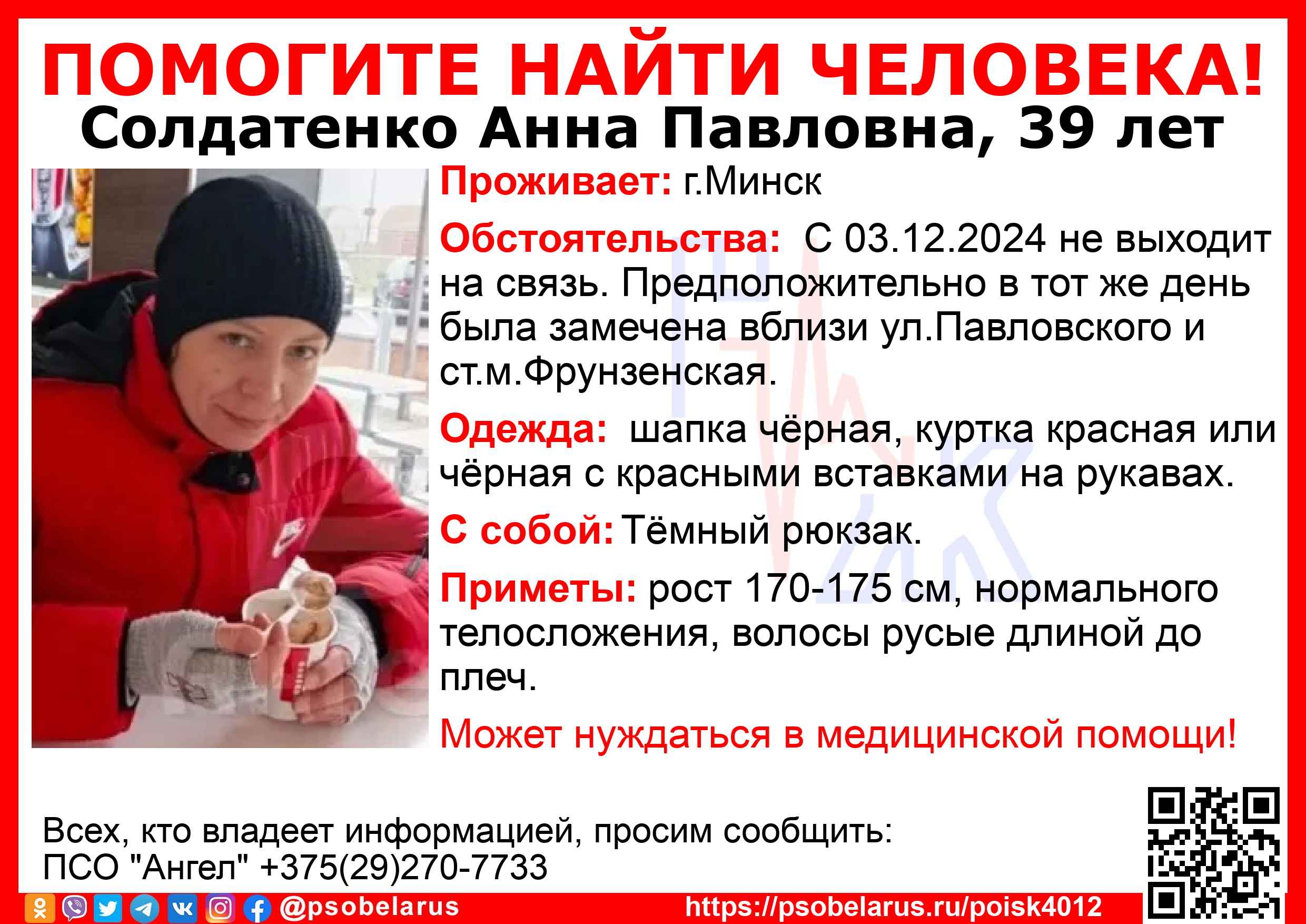 Скачать ориентировкуДля оперативного получения информации о пропавших людях и сборах на поиски можно подписаться на бота оповещения: Телеграм