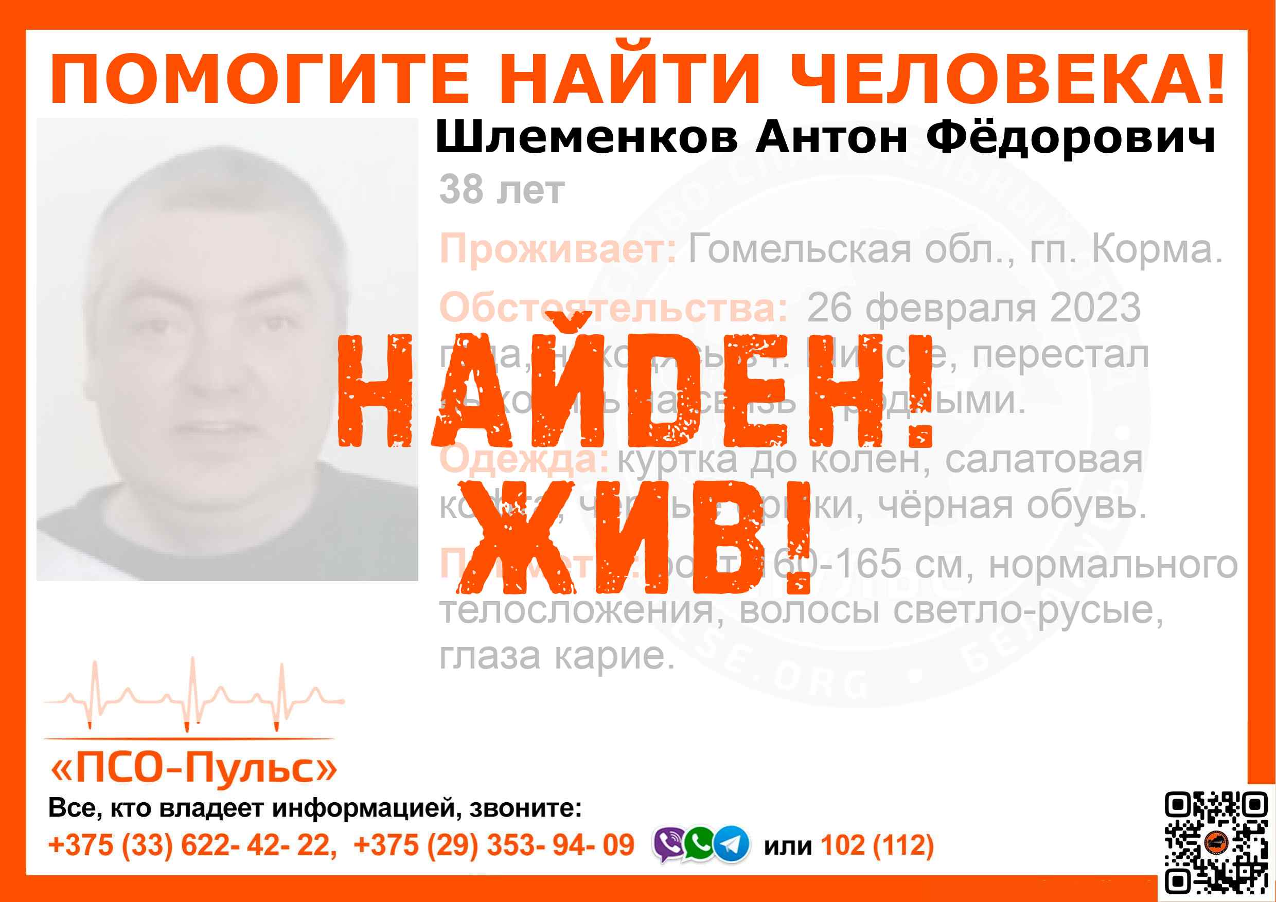 Всех, кто владеет информацией, просим сообщить: ПСО "ПСО-Пульс" +375(33)622-4222 |