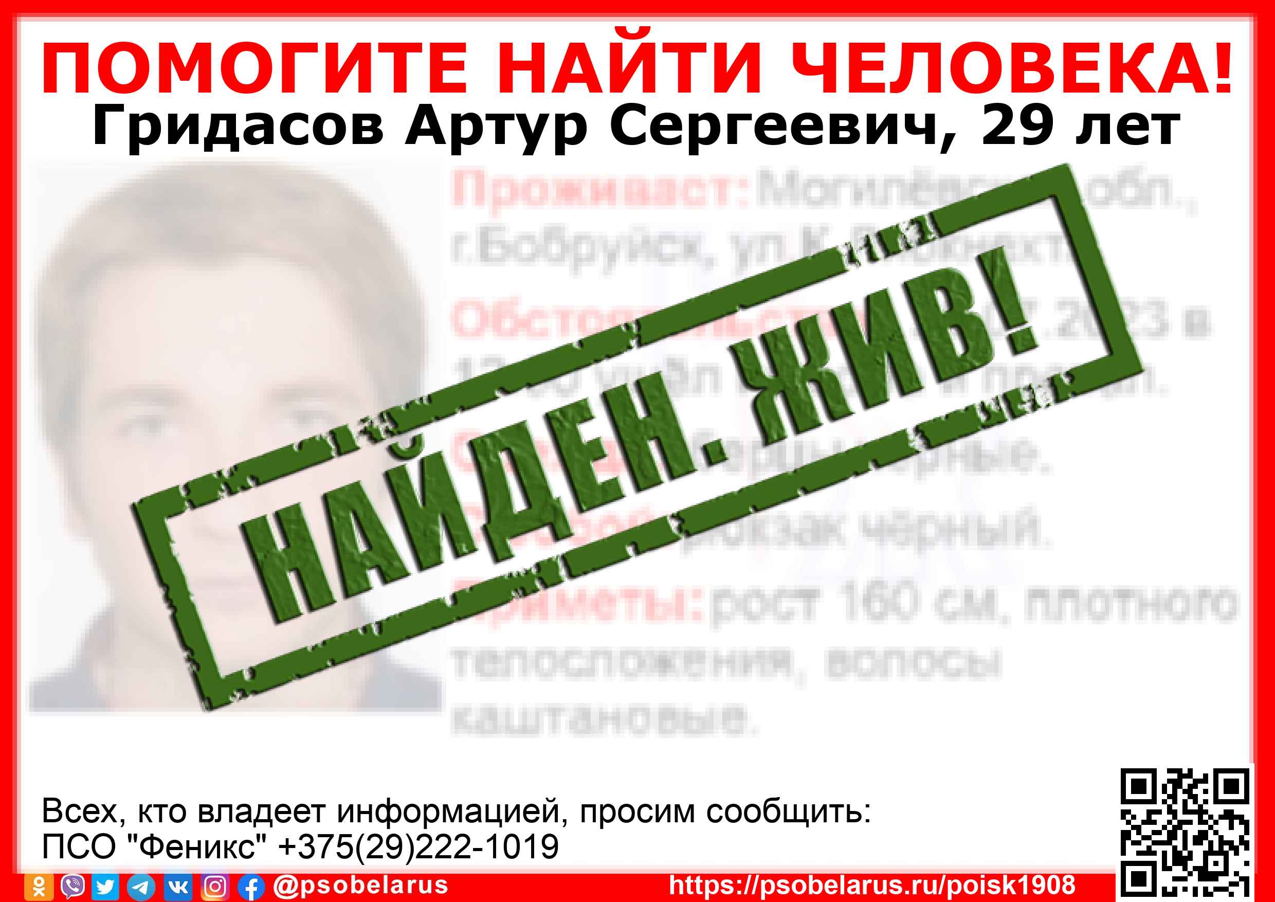 Всех, кто владеет информацией, просим сообщить: ПСО "Феникс" +375(29)222-1019 |